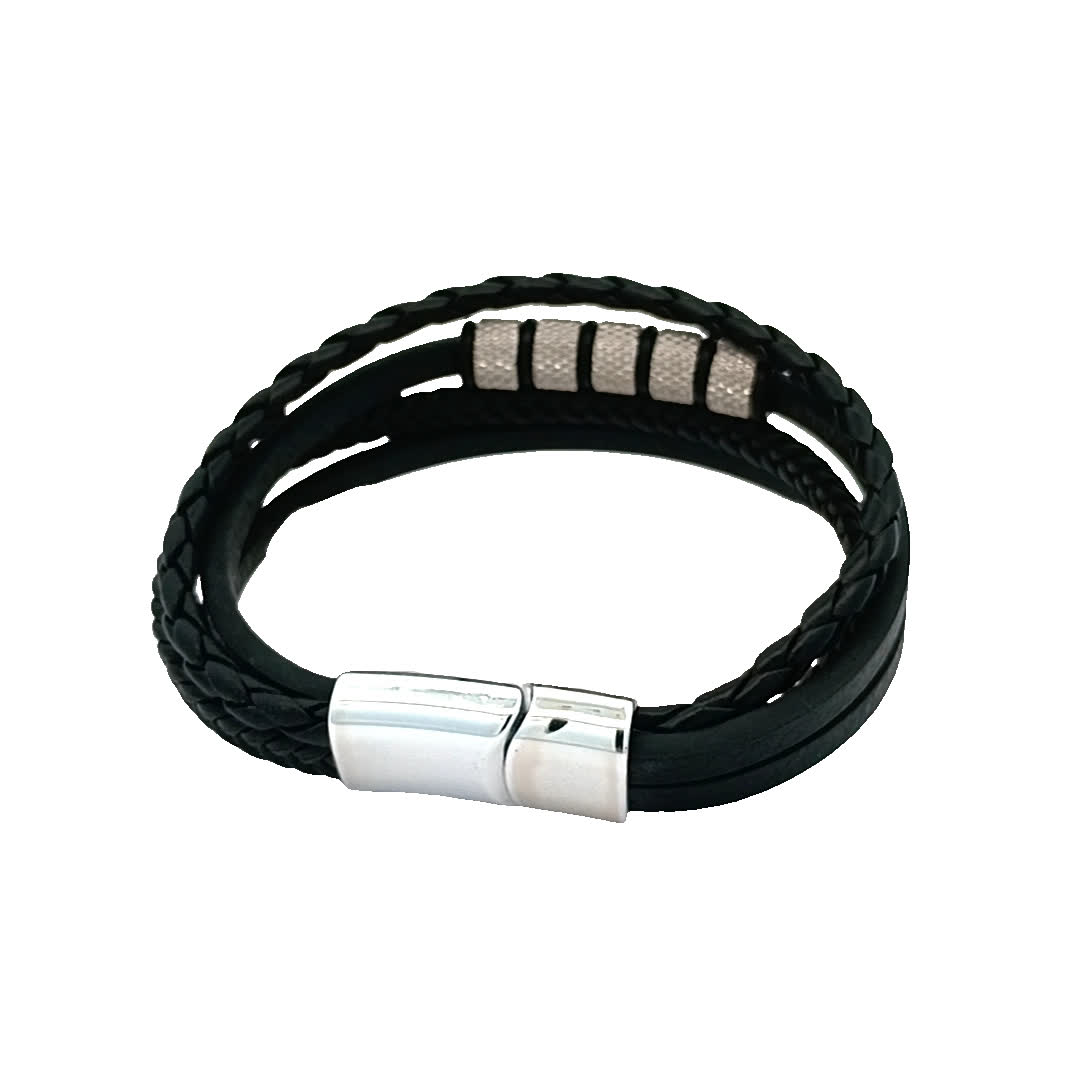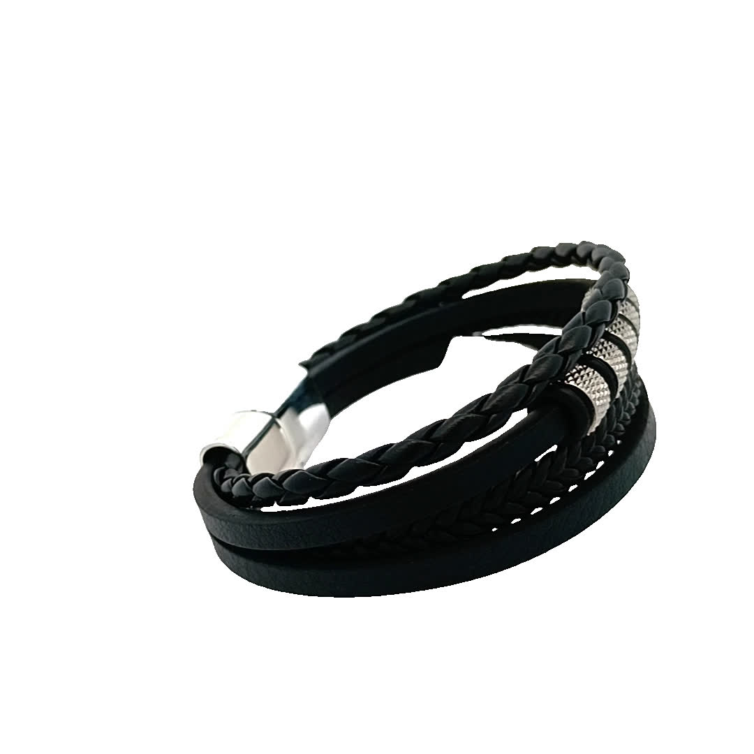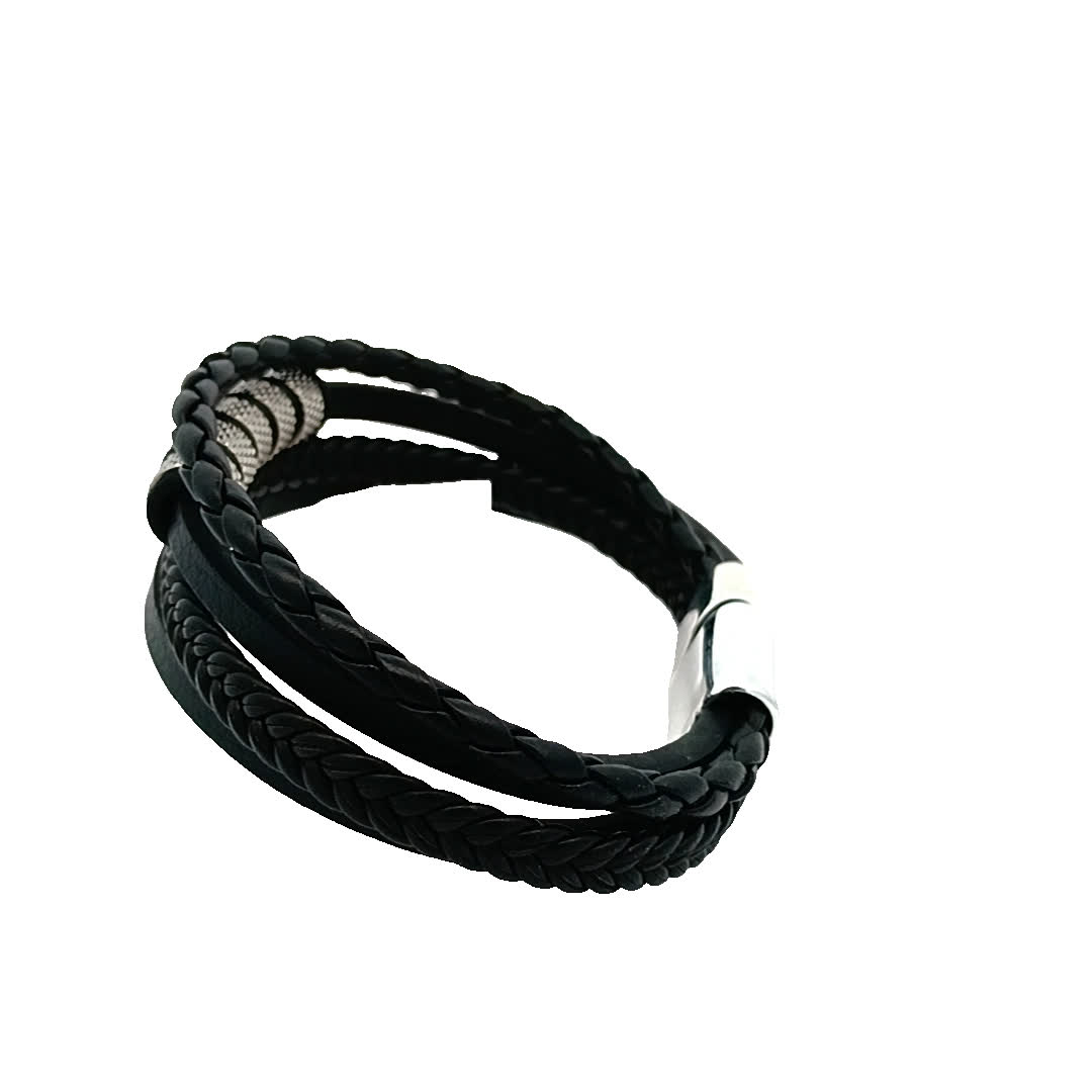 Ta stylowa czarna skórzana bransoletka ma wyjątkowy pleciony wzór, idealny do dodania odrobiny wyrafinowania do każdego stroju. Metalowe akcenty zapewniają nowoczesny akcent, dzięki czemu jest idealnym dodatkiem zarówno na okazje codzienne, jak i formalne.