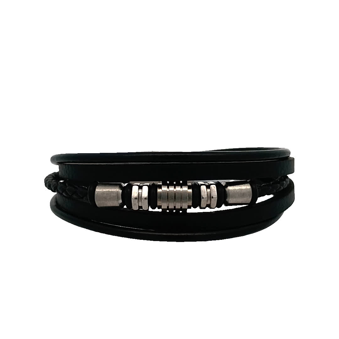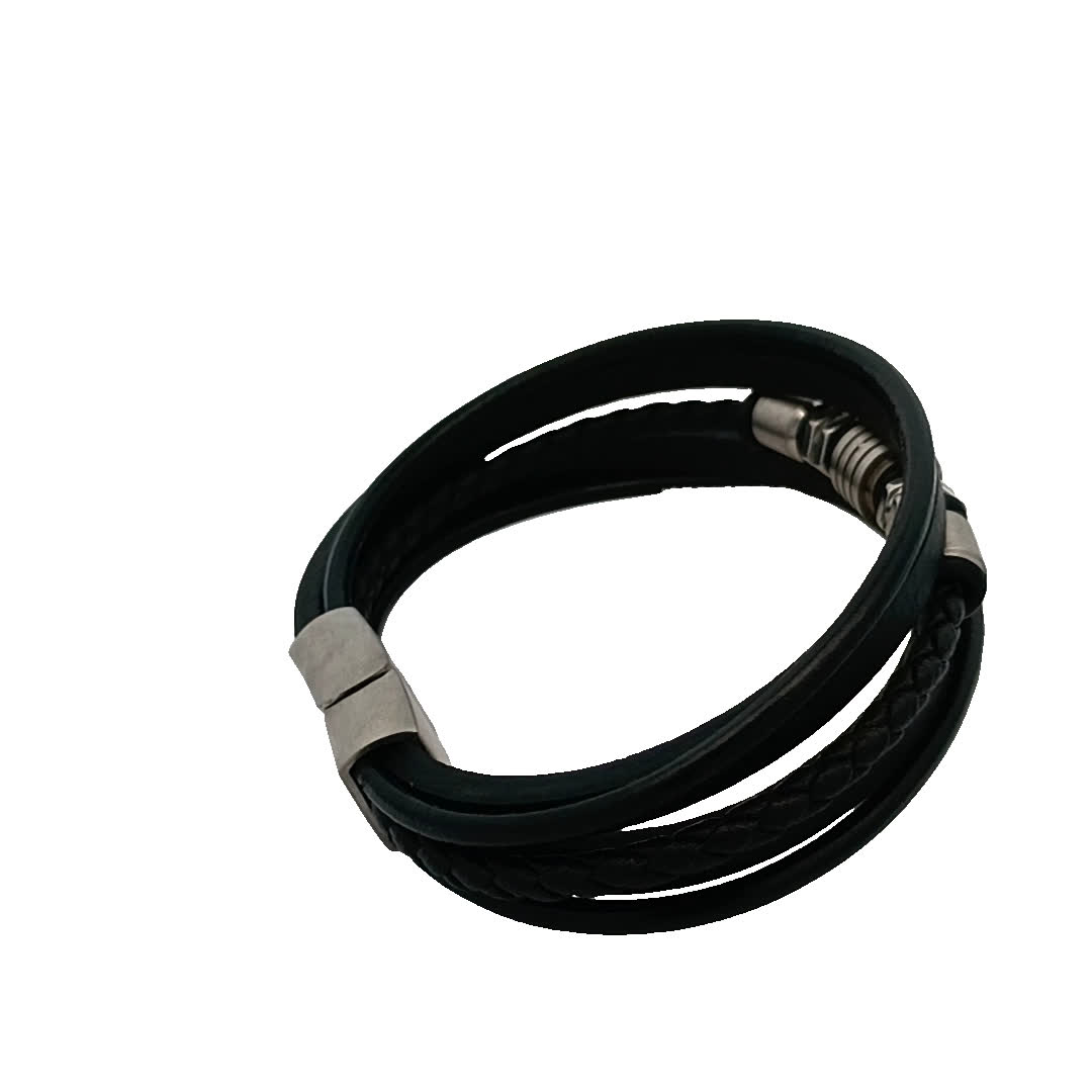 Ta stylowa czarna skórzana bransoletka łączy elegancję i nowoczesny design. Z misternymi plecionymi detalami i metalowymi akcentami, jest idealna zarówno na okazje codzienne, jak i formalne. Podnieś poziom swoich dodatków dzięki temu wszechstronnemu elementowi, który uzupełni każdy strój.