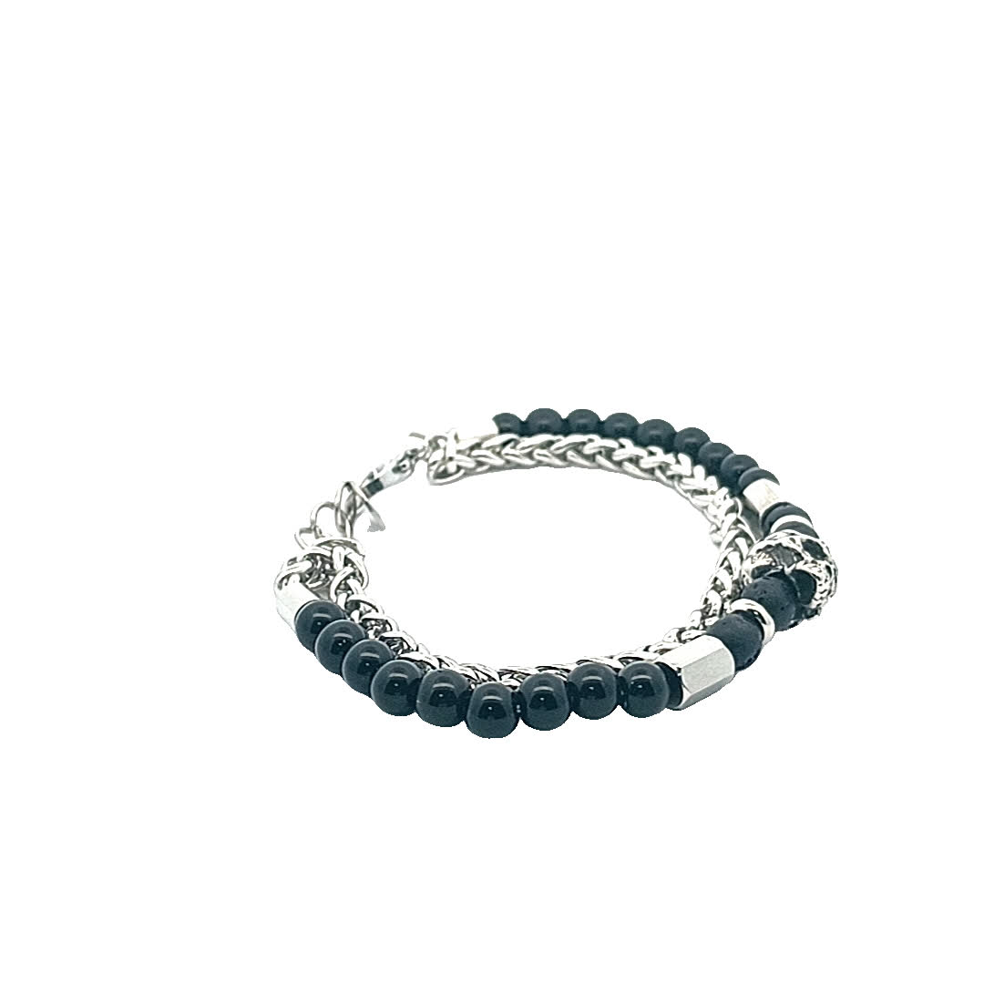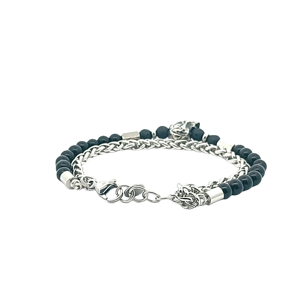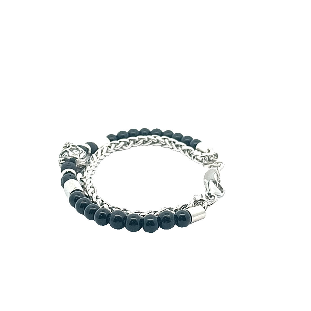 Ta uderzająca bransoletka z czaszką łączy w sobie odważny design z elegancją. Wykonana z mieszanki czarnych koralików i posrebrzanych akcentów, stanowi śmiały dodatek do każdego stroju. Idealna dla tych, którzy cenią wyjątkowe dodatki, które podkreślają ich indywidualność.
