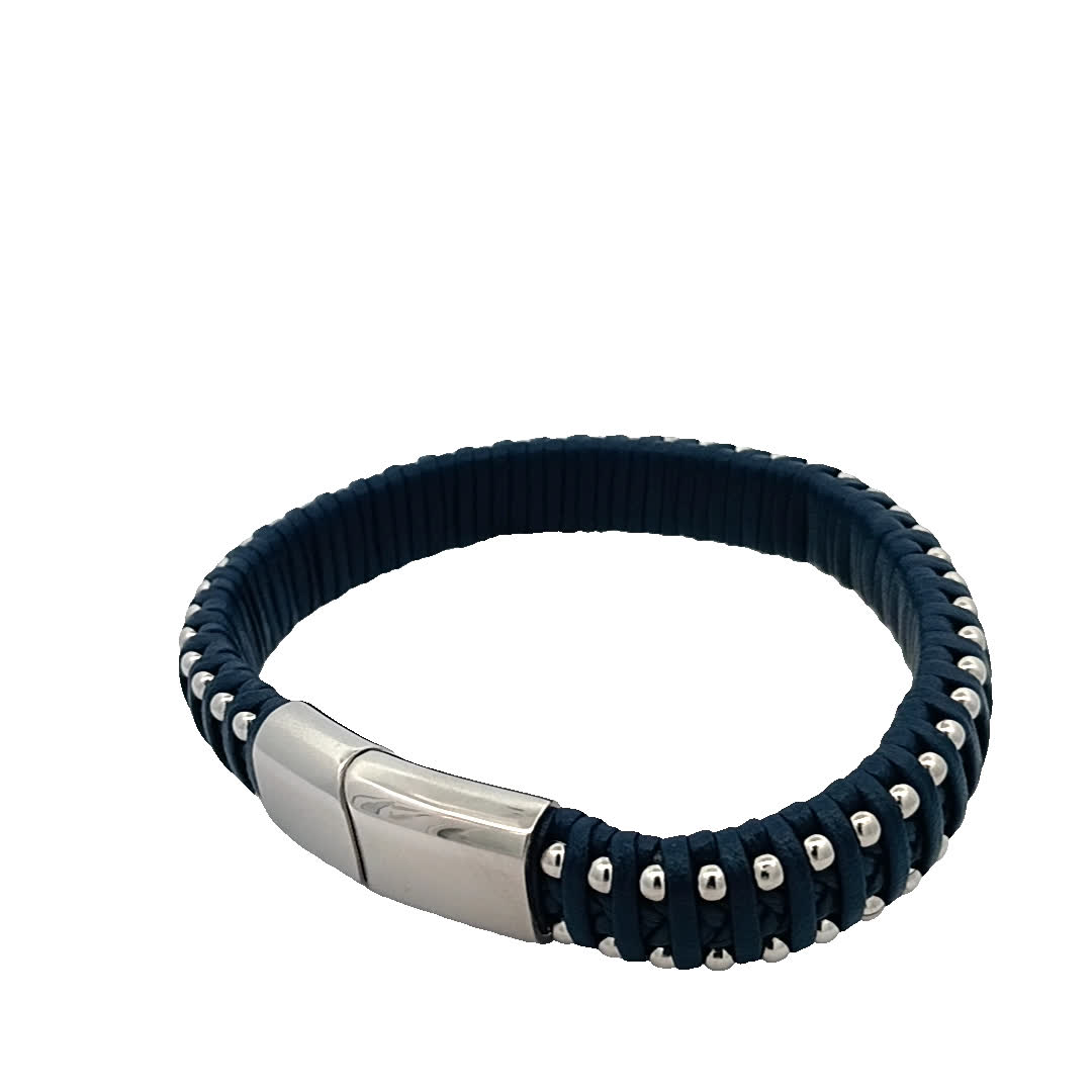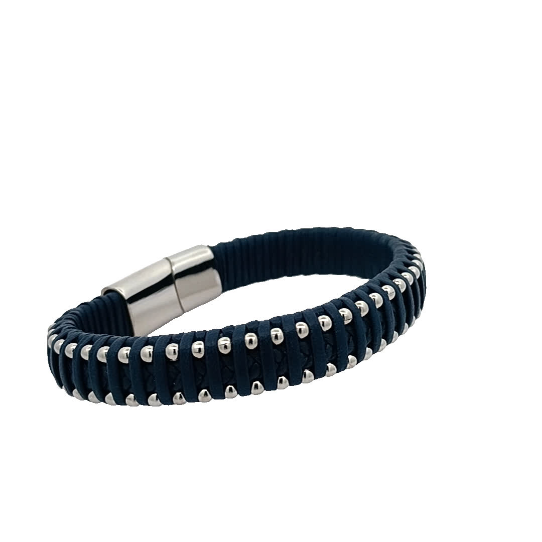 Podnieś poziom swoich dodatków dzięki tej stylowej niebieskiej skórzanej bransoletce. Dzięki unikalnemu tkanemu wzorowi i polerowanym posrebrzanym akcentom bez wysiłku łączy nowoczesną elegancję z niezobowiązującym urokiem. Idealna na każdą okazję, ta bransoletka jest niezbędnym dodatkiem do Twojej kolekcji biżuterii.