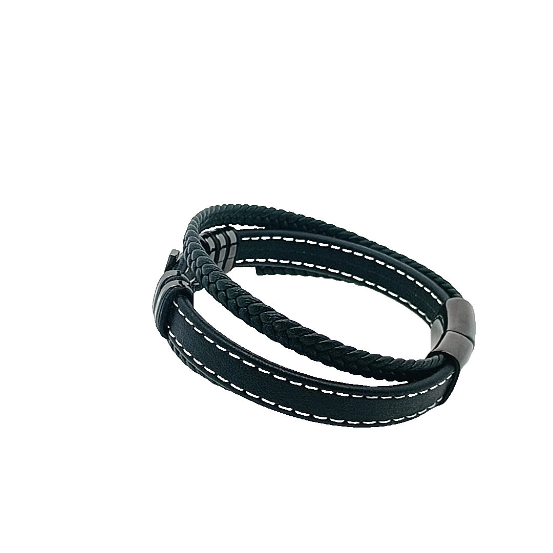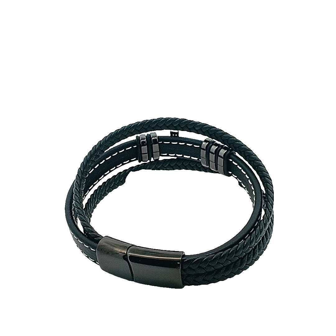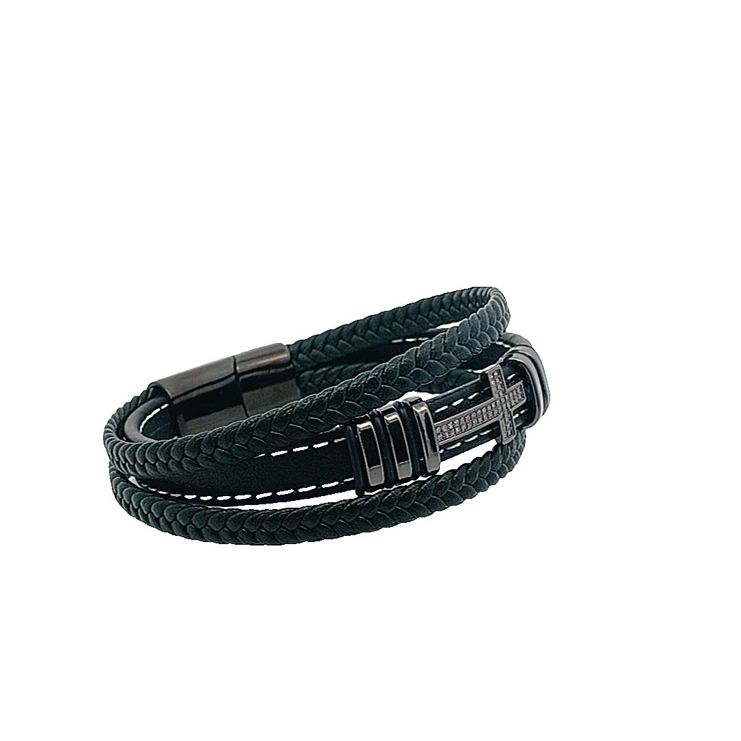 Podnieś poziom swoich dodatków dzięki tej stylowej czarnej skórzanej bransoletce. Dzięki wyjątkowemu plecionemu wzorowi i efektownemu zapięciu krzyżowemu doskonale łączy nowoczesną estetykę z ponadczasową elegancją. Idealna zarówno na okazje codzienne, jak i formalne, ta bransoletka jest niezbędnym dodatkiem do Twojej kolekcji biżuterii.