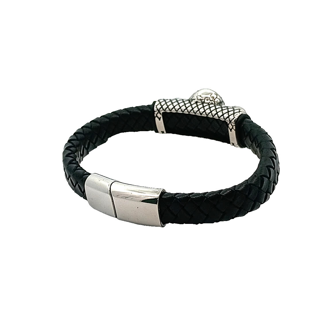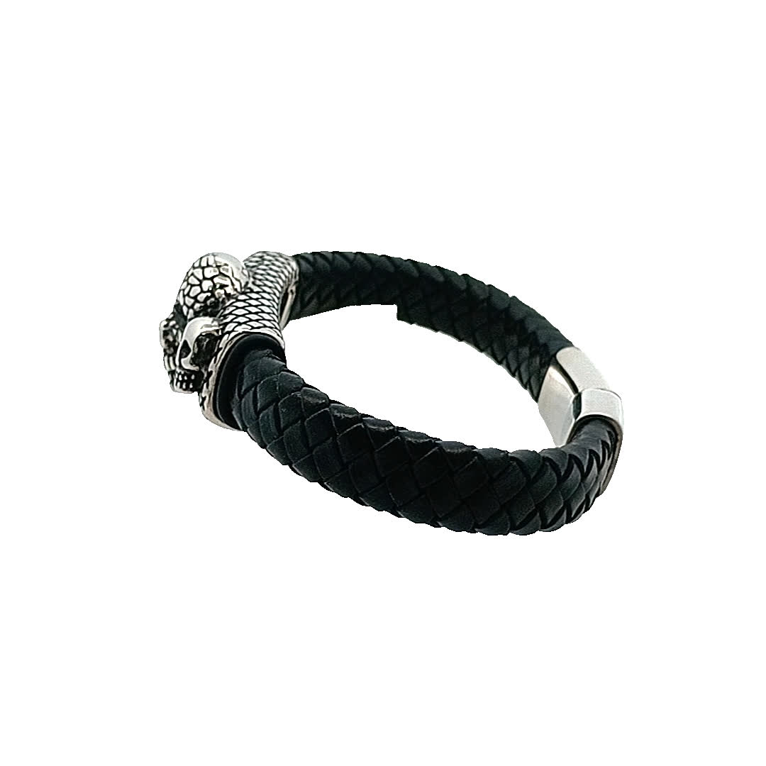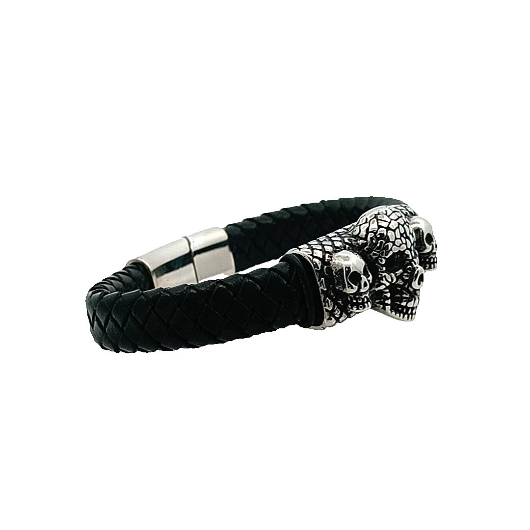 Ta uderzająca bransoletka ma wyjątkowy design z trzema misternie wykonanymi czaszkami, co czyni ją idealnym dodatkiem dla tych, którzy cenią sobie odważny styl. Pleciona czarna skóra dodaje odrobinę surowej elegancji, dzięki czemu wyróżnia się w każdej kolekcji.