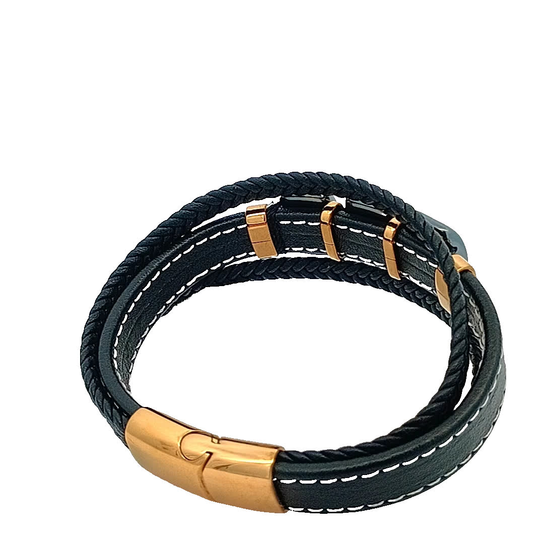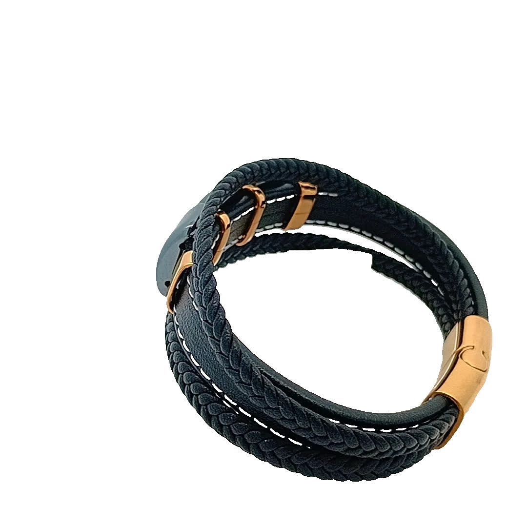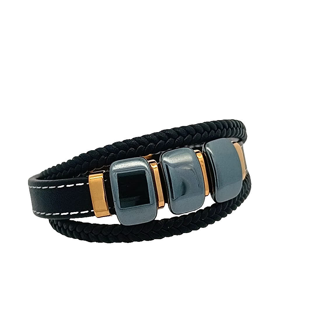 Podnieś poziom swoich dodatków dzięki tej oszałamiającej czarno-złoconej bransoletce. Dzięki wyjątkowemu wzornictwu z eleganckimi, polerowanymi kamieniami i plecionym skórzanym paskiem, bez wysiłku łączy elegancję i nowoczesność. Idealna zarówno na okazje codzienne, jak i formalne, ta część jest niezbędna w każdej kolekcji biżuterii.