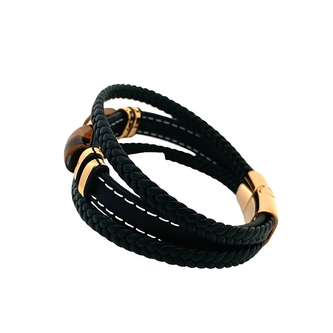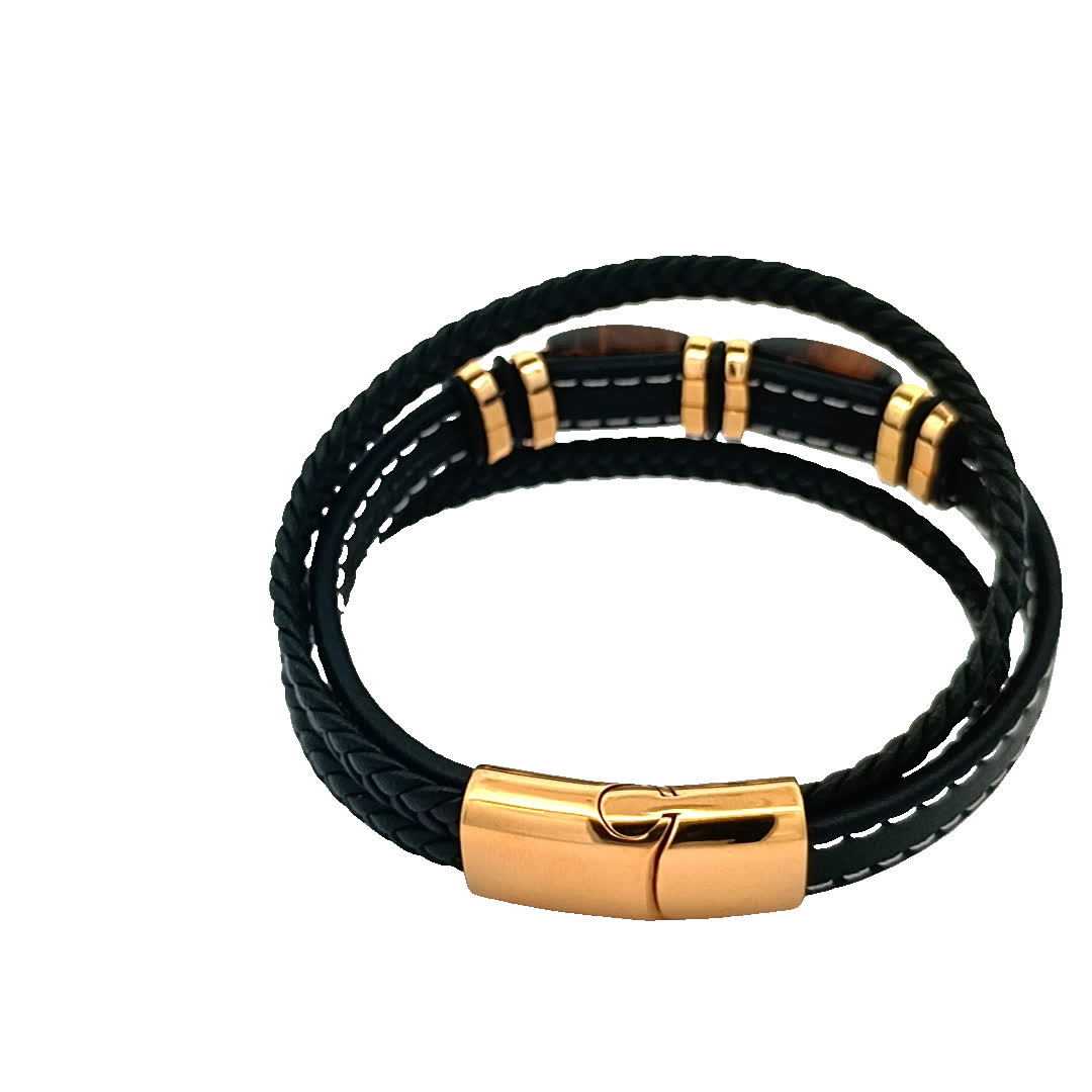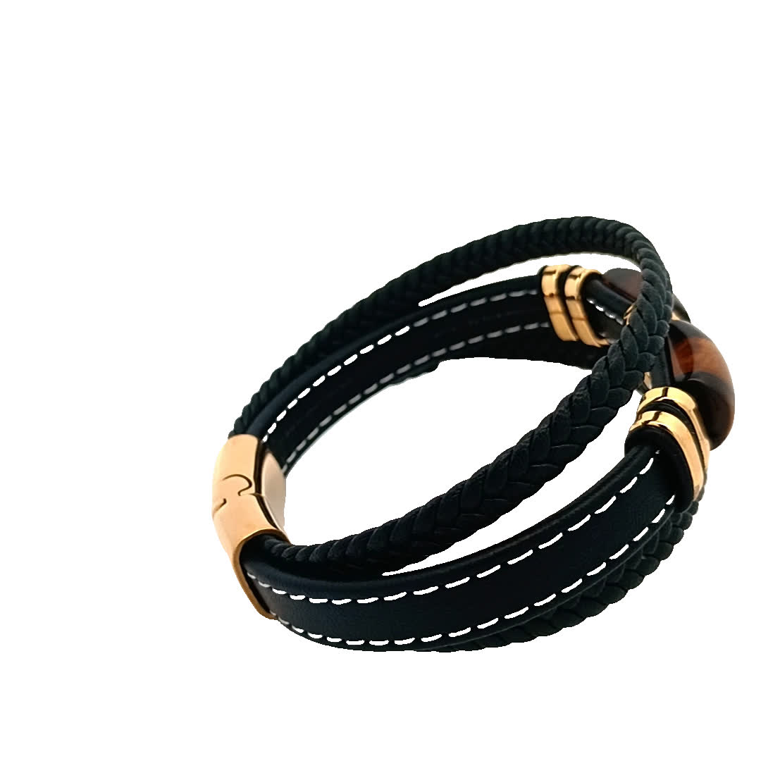 Ta oszałamiająca bransoletka łączy elegancję czarnej skóry z luksusowym akcentem złoconych akcentów. Centralny element zdobi uderzający kamień tygrysie oko, dodający wyjątkowego charakteru Twojej kolekcji akcesoriów. Idealna zarówno na okazje codzienne, jak i formalne, ta część jest niezbędna dla każdego miłośnika biżuterii.