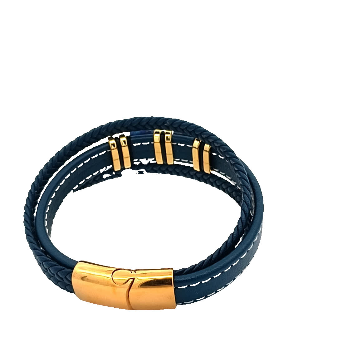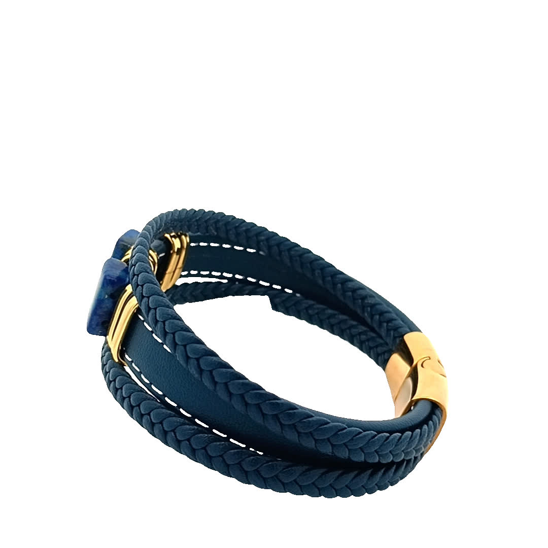 Ta oszałamiająca niebieska skórzana bransoletka wyróżnia się wyjątkowym wzorem z dwoma uderzającymi niebieskimi kamieniami osadzonymi w złoconych akcentach. Idealna do dodania odrobiny elegancji do każdego stroju, bez wysiłku łączy styl i wyrafinowanie. Noś ją samodzielnie lub zestaw z innymi bransoletkami, aby uzyskać modny, warstwowy wygląd.