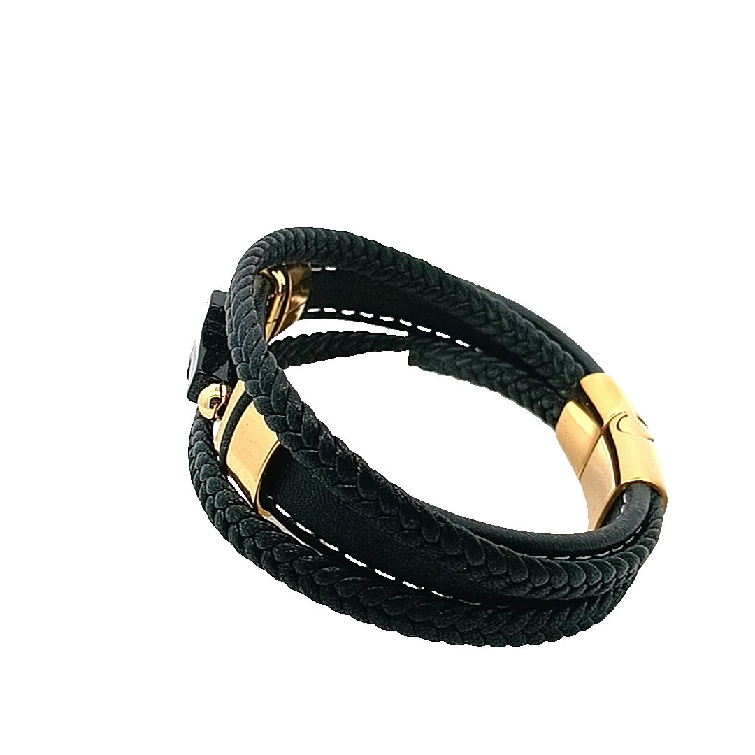 Podnieś poziom swoich dodatków dzięki tej stylowej czarno-złoconej bransoletce. Dzięki wyjątkowemu plecionemu wzorowi i efektownemu krzyżowi w centralnym punkcie, bez wysiłku łączy elegancję z odrobiną śmiałości. Idealna zarówno na okazje codzienne, jak i formalne, ta bransoletka jest niezbędnym dodatkiem do Twojej kolekcji biżuterii.