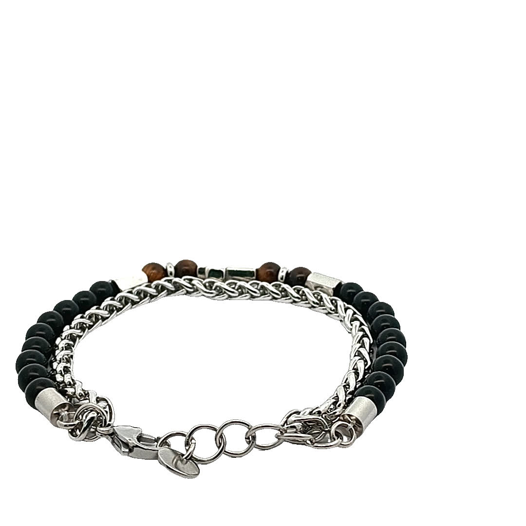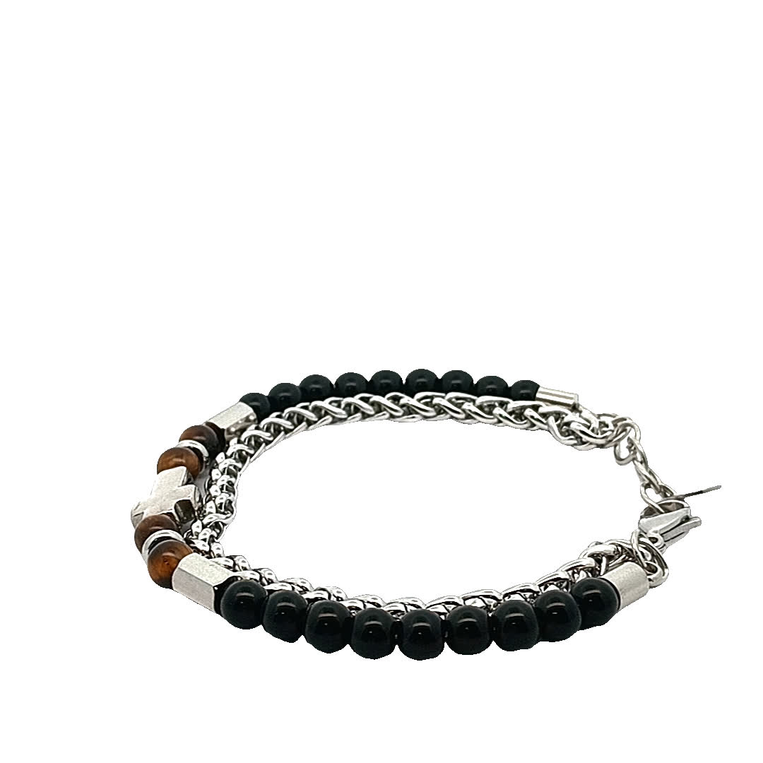 Podnieś poziom swoich dodatków dzięki tej stylowej bransoletce z koralikami i krzyżem. Ta wyjątkowa kombinacja czarnych koralików i metalowych akcentów doskonale sprawdzi się zarówno na co dzień, jak i na formalne okazje. Zawieszka z krzyżem dodaje odrobinę duchowości, dzięki czemu jest znaczącym dodatkiem do Twojej kolekcji biżuterii.