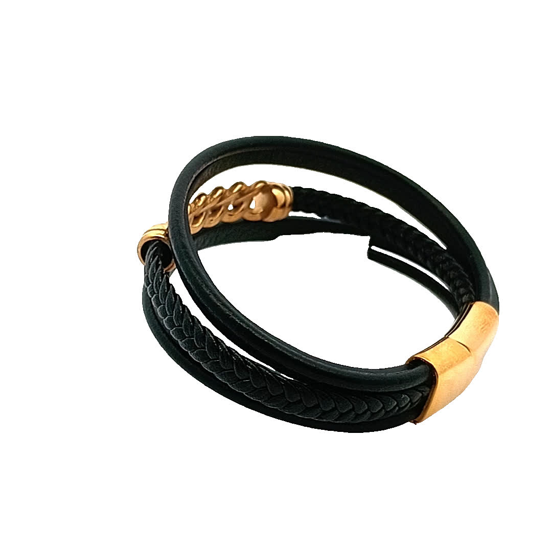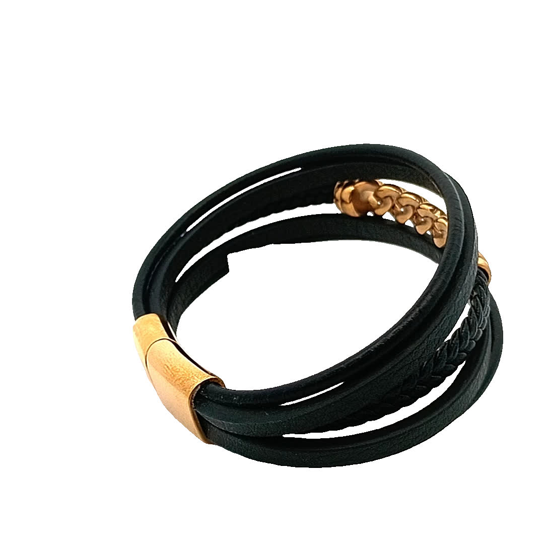 Podnieś poziom swoich dodatków dzięki tej stylowej czarnej skórzanej bransoletce. Dzięki wyjątkowemu plecionemu wzorowi i efektownemu kamieniemu łańcuszkowi, ten element bez wysiłku łączy elegancję z nowoczesnym charakterem. Idealny zarówno na okazje codzienne, jak i formalne, dodaje odrobinę wyrafinowania do każdego stroju.