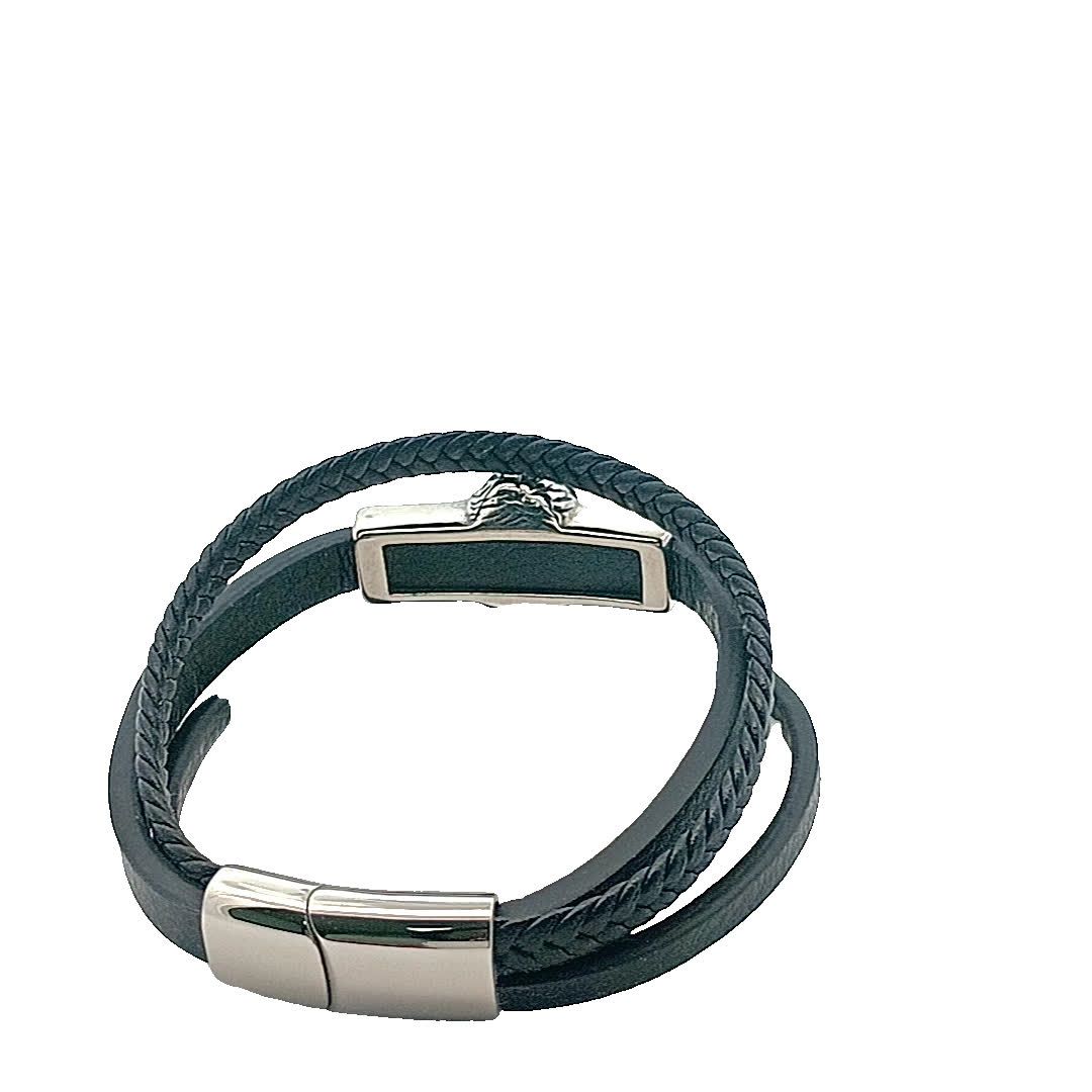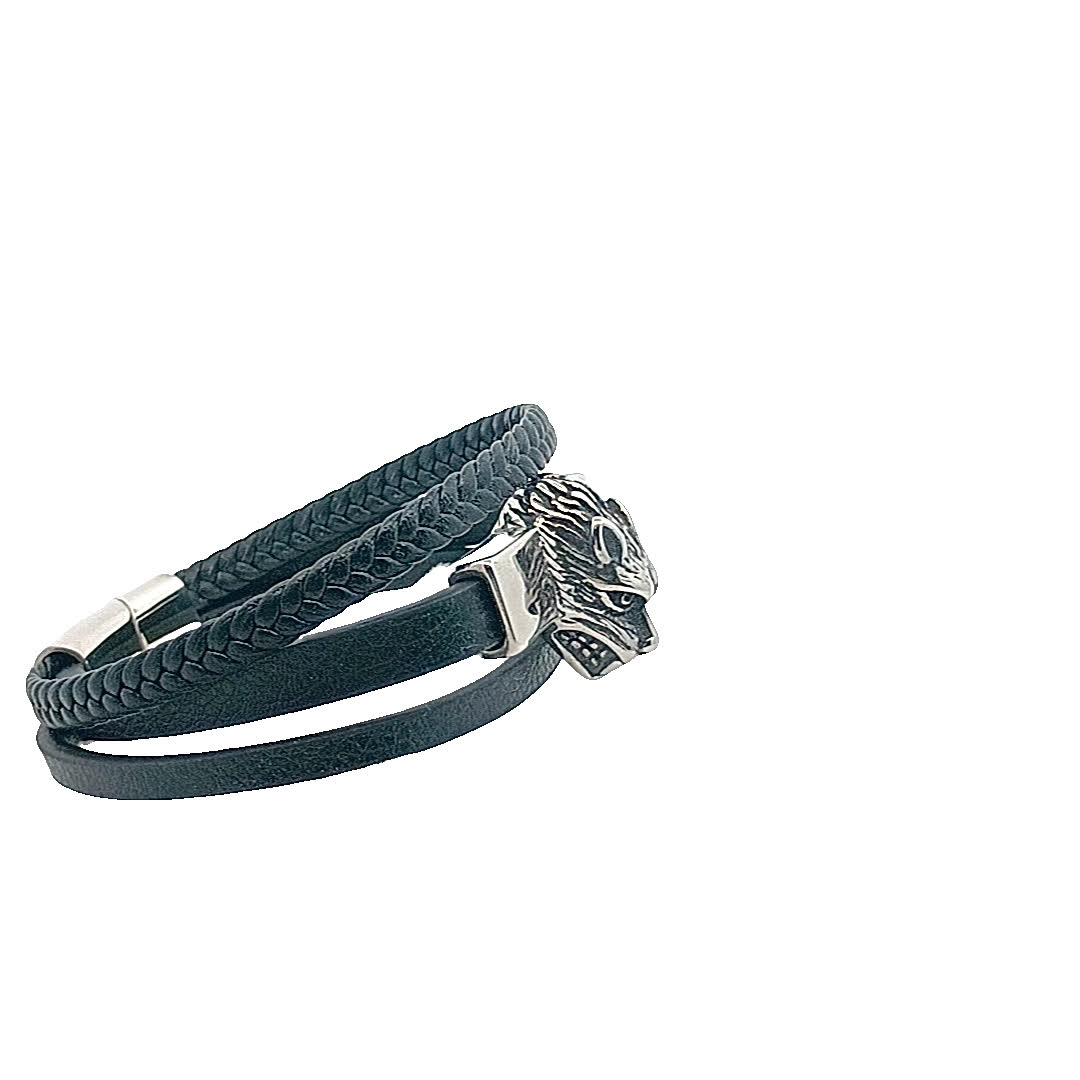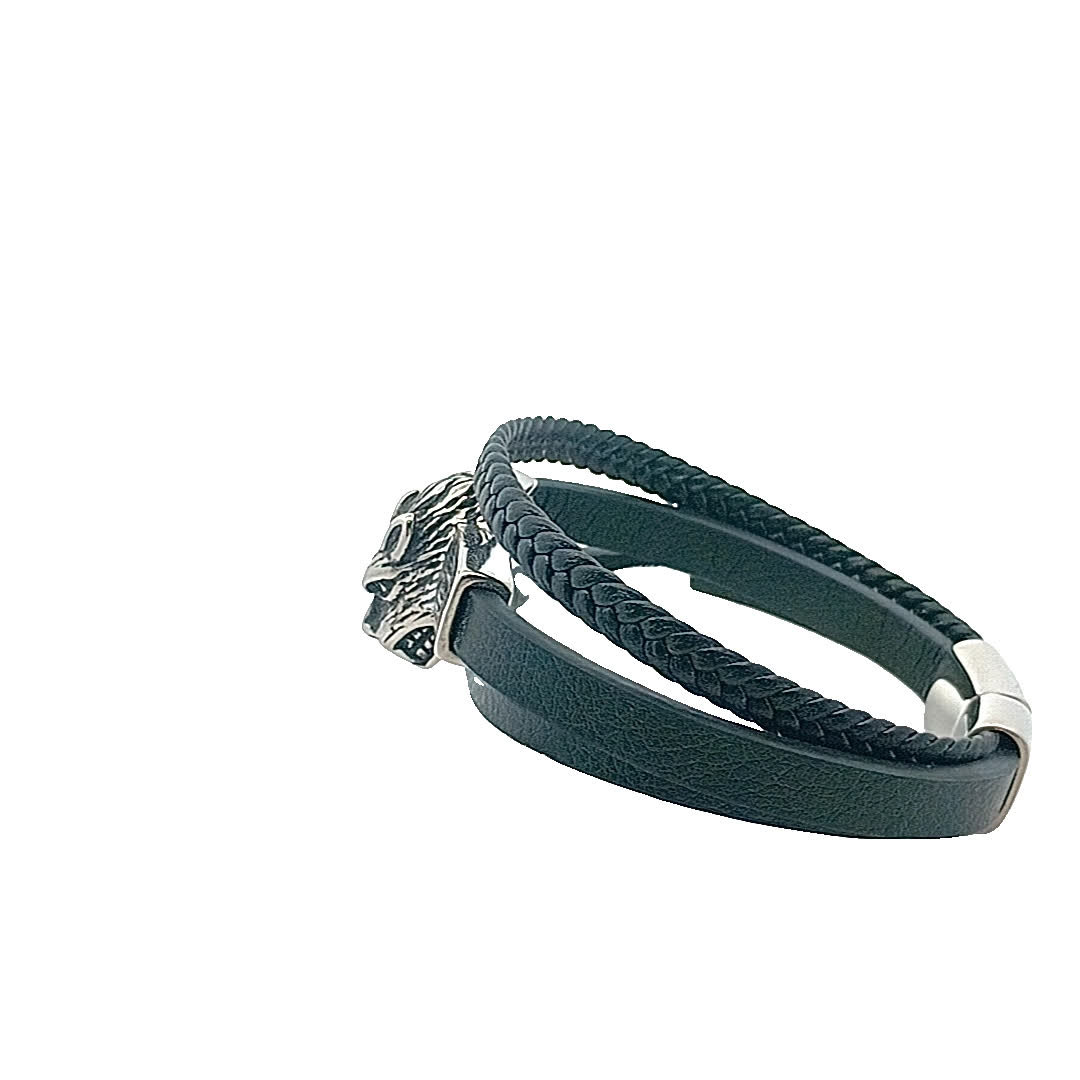Ta uderzająca czarna skórzana bransoletka ma wyjątkowy pleciony wzór, uzupełniony śmiałym posrebrzanym zapięciem w kształcie głowy wilka. Idealna do dodania odważnego akcentu do każdego stroju, płynnie łączy styl i indywidualność. Noś ją samodzielnie lub zestaw z innymi akcesoriami, aby uzyskać modny, warstwowy wygląd.