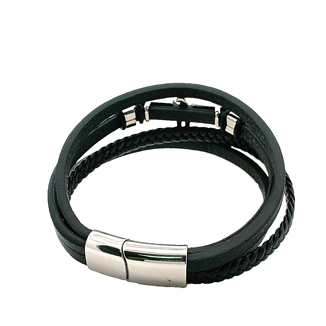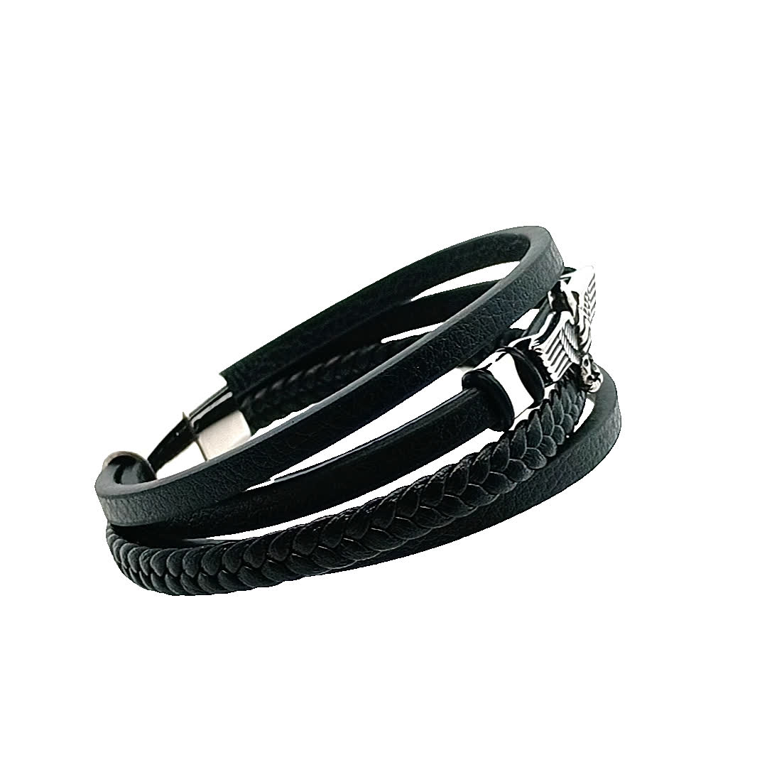 Ta uderzająca czarna skórzana bransoletka ma wyjątkowy pleciony wzór, uzupełniony odważnym emblematem orła na środku. Idealna do dodania odrobiny surowej elegancji do każdego stroju, ta część jest idealna zarówno na okazje codzienne, jak i formalne.