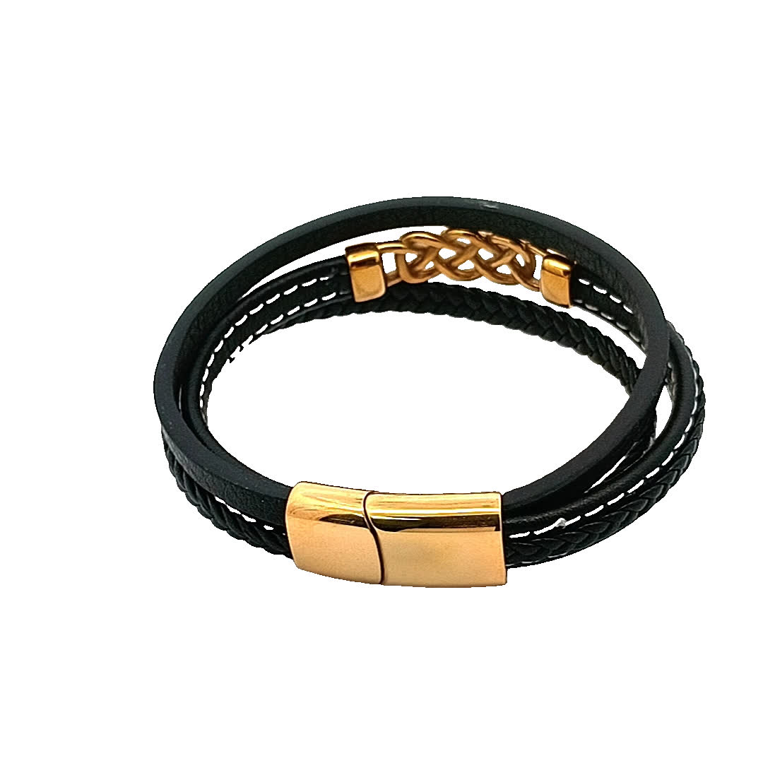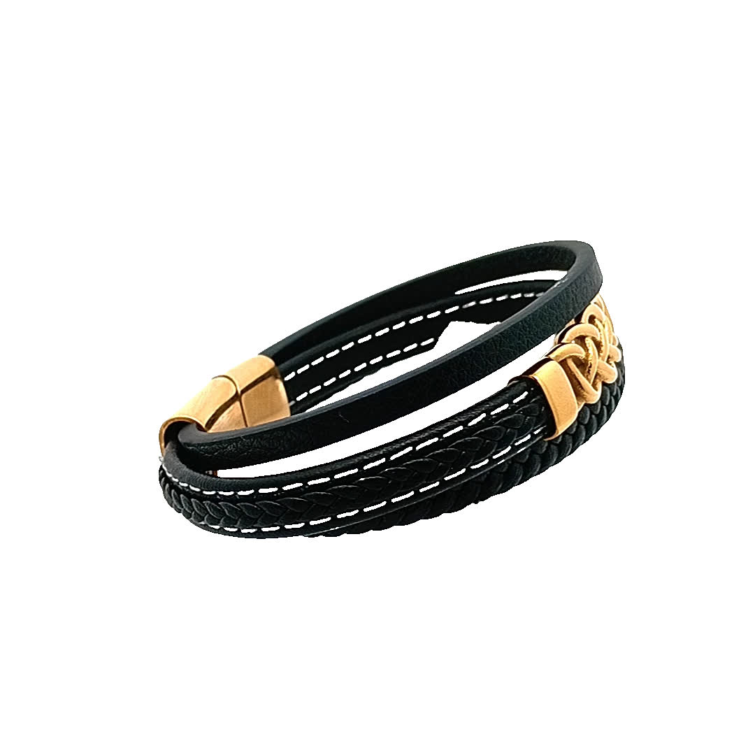 Ta oszałamiająca czarna skórzana bransoletka ma wyjątkowy pleciony wzór, zaakcentowany pięknym złocistym zapięciem. Idealna zarówno na okazje codzienne, jak i formalne, dodaje odrobinę wyrafinowania do każdego stroju. Noś ją samodzielnie lub zestaw z innymi bransoletkami, aby uzyskać modny, warstwowy wygląd.