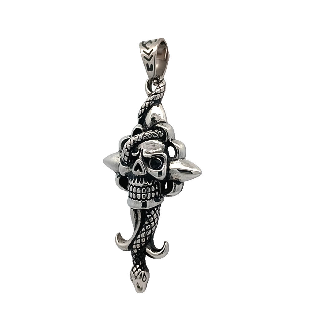 Ten efektowny wisiorek przedstawia szczegółową czaszkę splecioną z wężem, symbolizującą dualizm życia i śmierci. Wykonany z wysokiej jakości materiałów, prezentuje skomplikowane wzory, które przyciągają wzrok i wywołują rozmowę. Idealny dla tych, którzy cenią wyjątkową i awangardową biżuterię.