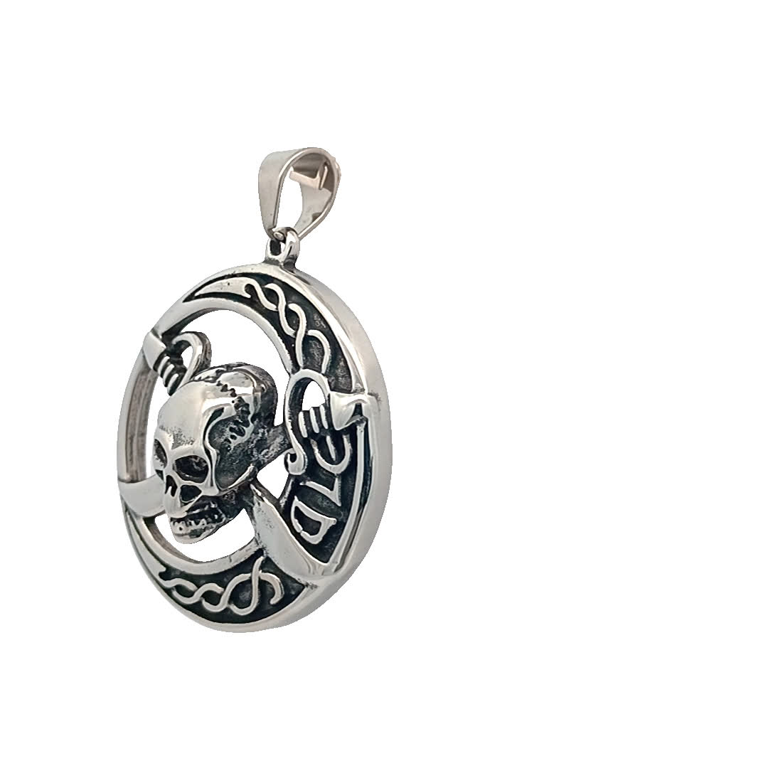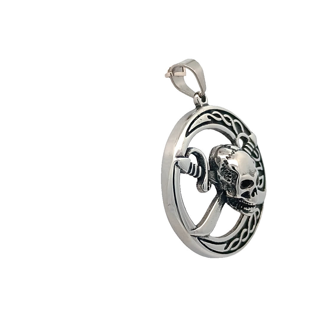 Ten efektowny wisiorek ma szczegółowy wzór czaszki przeplatany mieczami, co czyni go idealnym dodatkiem dla tych, którzy kochają odważny i odważny styl. Wykonany z wysokiej jakości materiałów, prezentuje misterne rzemiosło, które wyróżnia się w każdej kolekcji biżuterii.