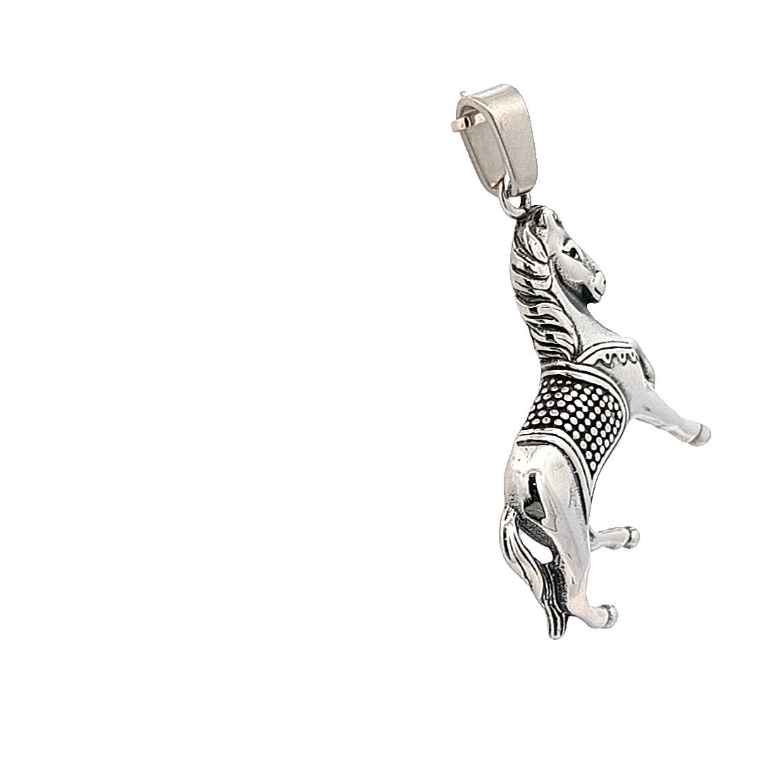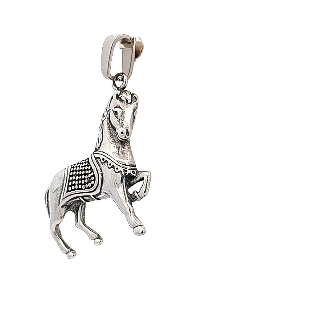 Ten oszałamiający posrebrzany wisiorek z koniem oddaje ducha wolności i wdzięku. Wykonany z misternymi detalami, przedstawia konia, który staje dęba, symbolizując siłę i elegancję. Idealny dla miłośników koni lub każdego, kto chce dodać wyjątkowy akcent do swojej kolekcji biżuterii.