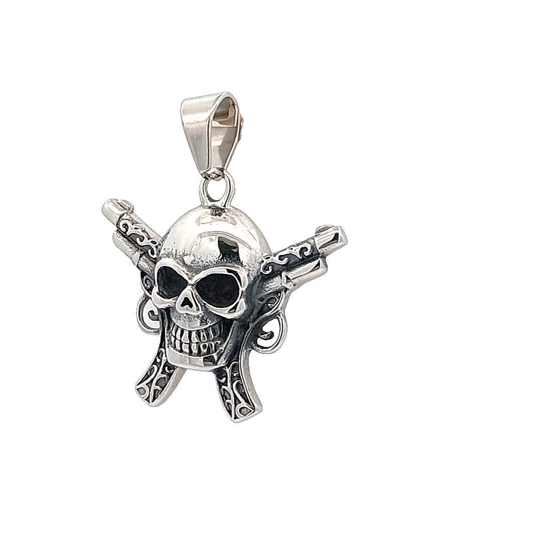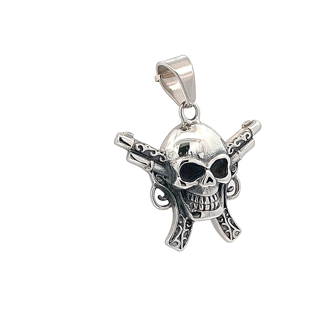 Ten efektowny wisiorek ma odważny wzór czaszki flankowany dwoma misternie szczegółowymi pistoletami, idealny dla tych, którzy kochają buntowniczego ducha. Wykonany z wysokiej jakości stali, dodaje wyjątkowego akcentu do każdego stroju, dzięki czemu jest idealnym dodatkiem zarówno do swobodnych, jak i odważnych stylów.