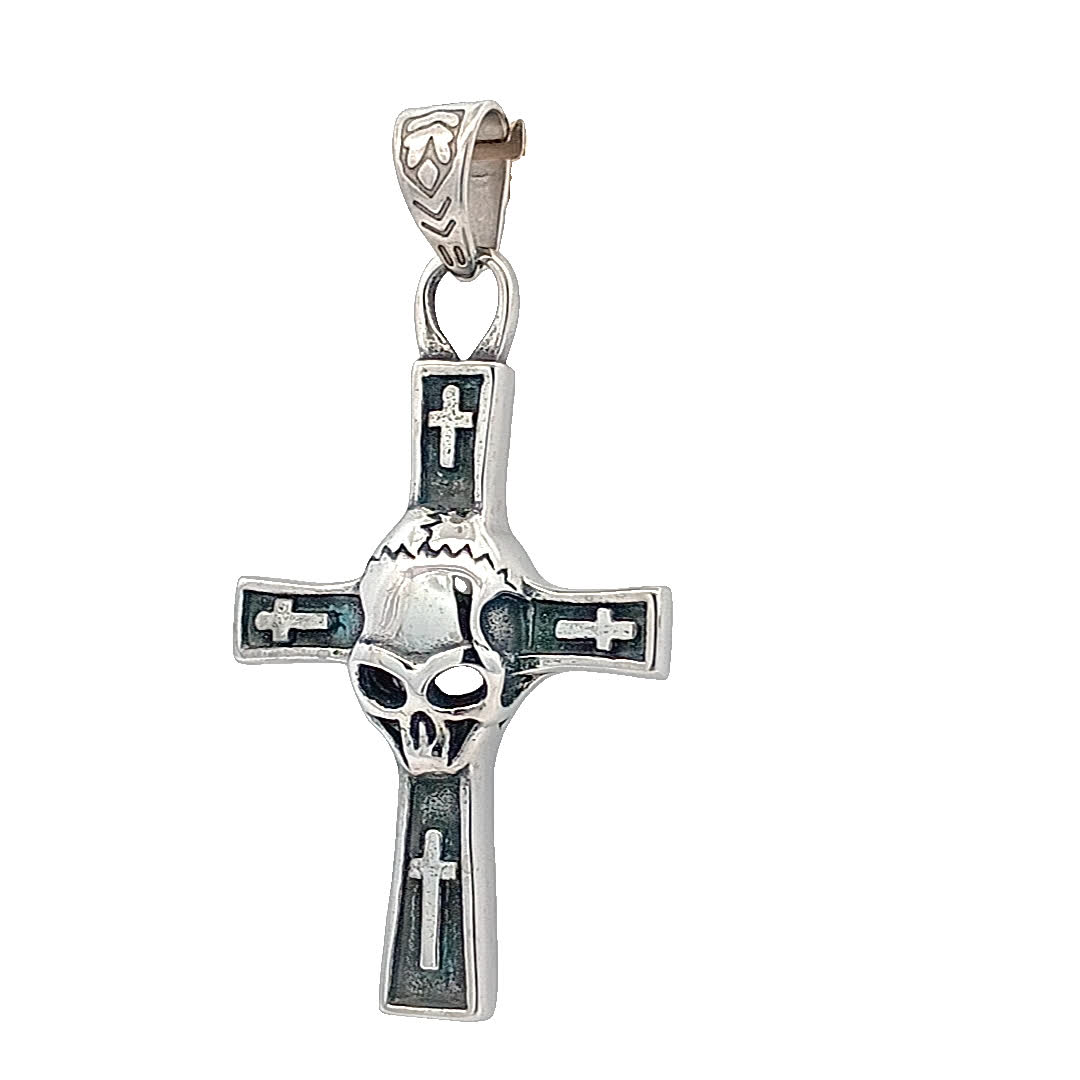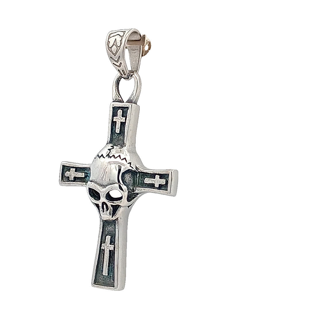 Ten efektowny wisiorek ma wyjątkowy wzór czaszki zintegrowany z klasycznym kształtem krzyża, co czyni go odważnym elementem. Wykonany z wysokiej jakości materiałów, prezentuje misterne detale, które przyciągają uwagę i wywołują rozmowę. Idealny dla tych, którzy cenią sobie awangardową, alternatywną biżuterię.