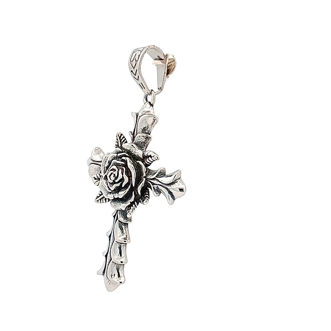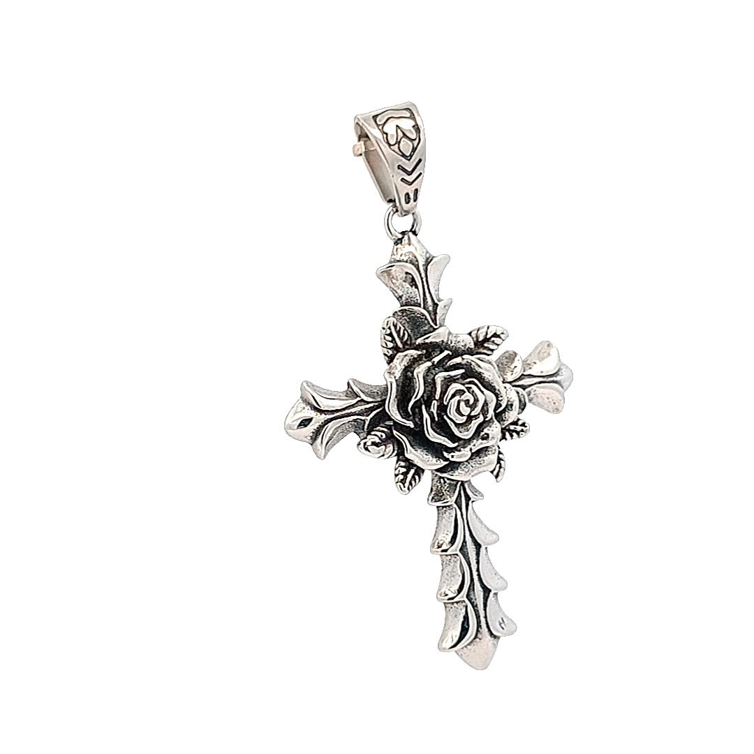 Ten oszałamiający posrebrzany krzyż wisiorek charakteryzuje się misternymi detalami, prezentując pięknie wykonaną różę w środku. Idealny do dodania odrobiny elegancji do każdego stroju, symbolizuje wiarę i piękno. Noś go jako element oświadczenia lub subtelne przypomnienie swoich przekonań.