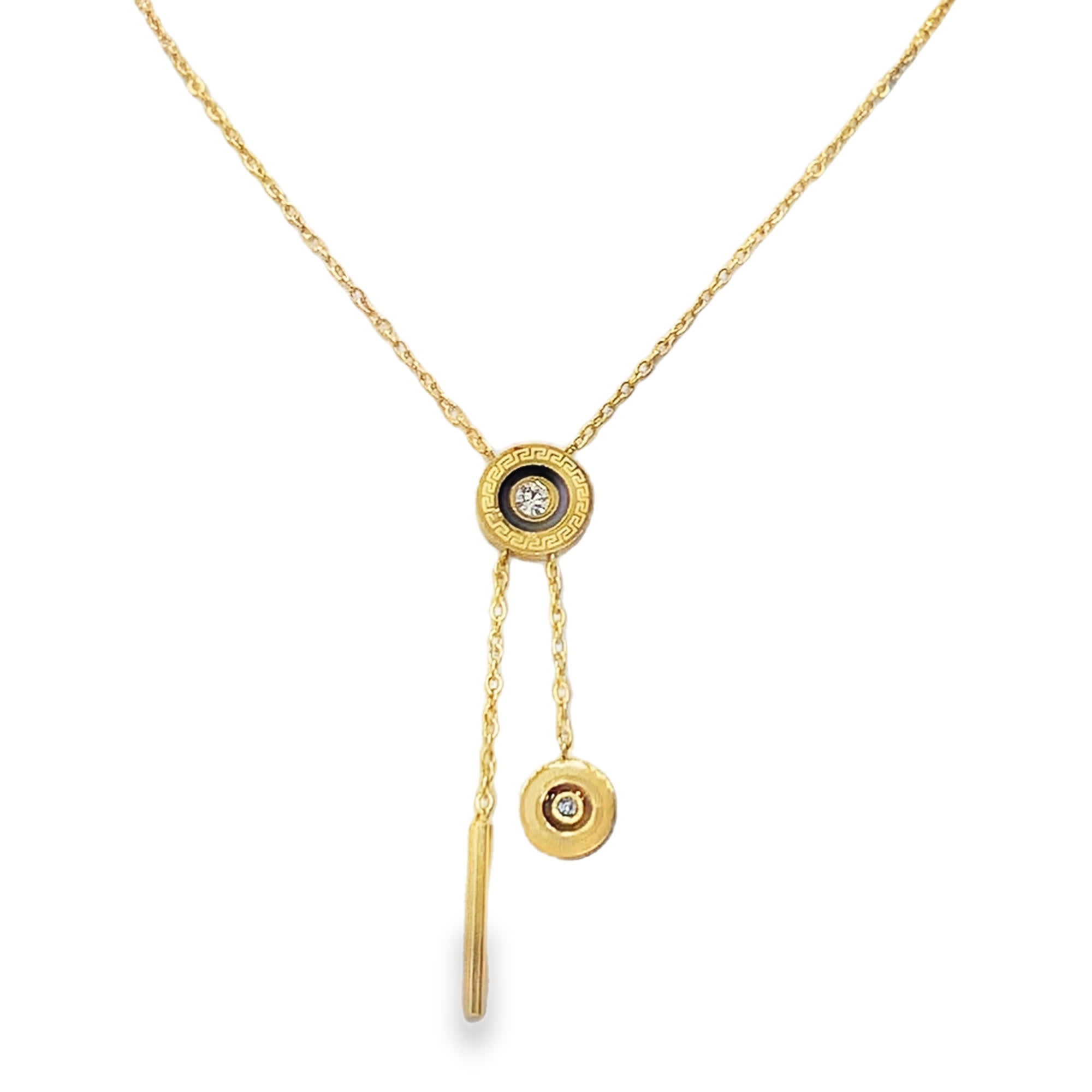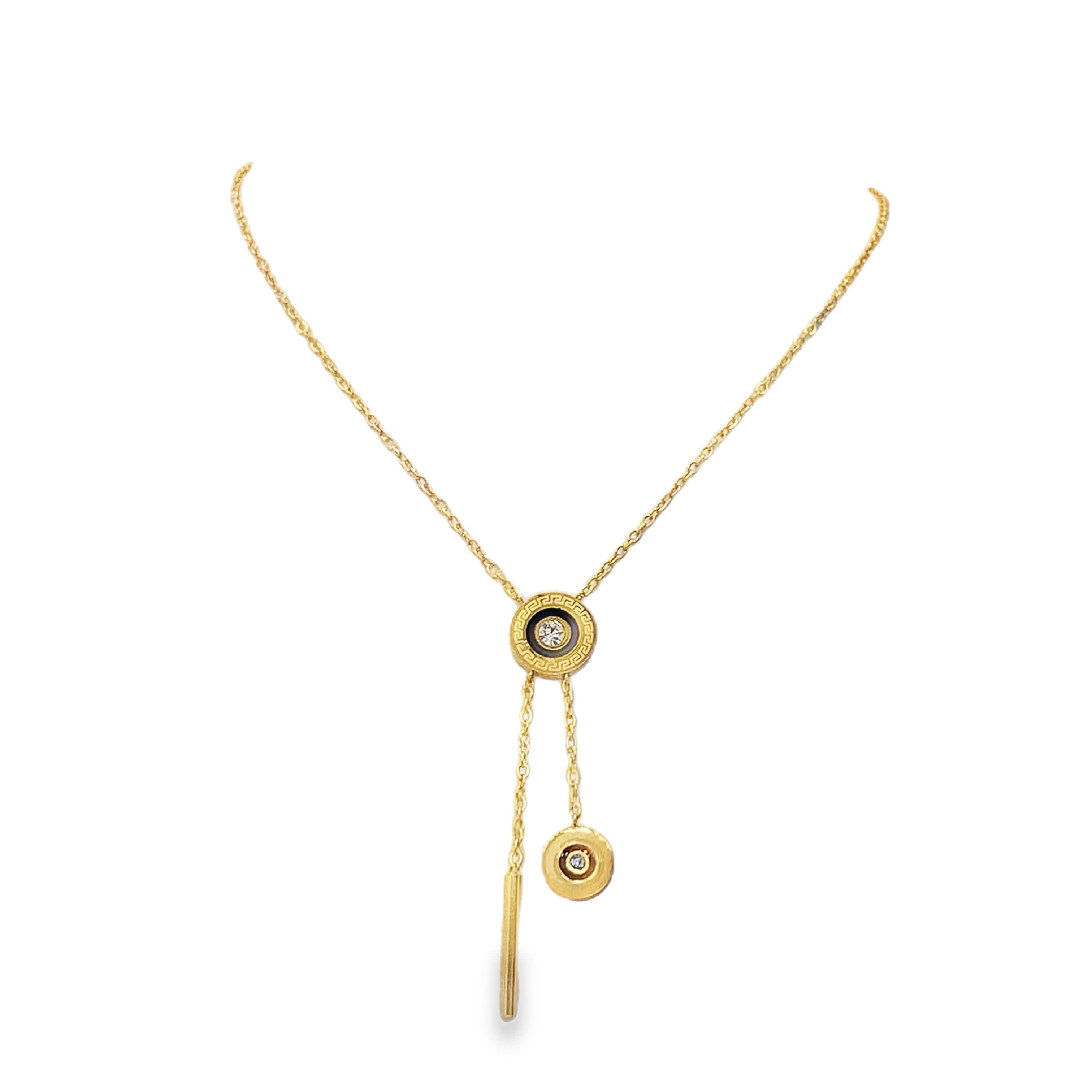 Podkreśl swój styl tym wykwintnym naszyjnikiem wykonanym z lśniącej żółtej stali. Okrągłe kamienie lśnią wyjątkowym blaskiem. Ten ponadczasowy element emanuje wyrafinowaniem i luksusem, idealnie nadając się do dodania odrobiny blasku na każdą okazję. To wyraz wyrafinowanego gustu i nieprzemijającego piękna.