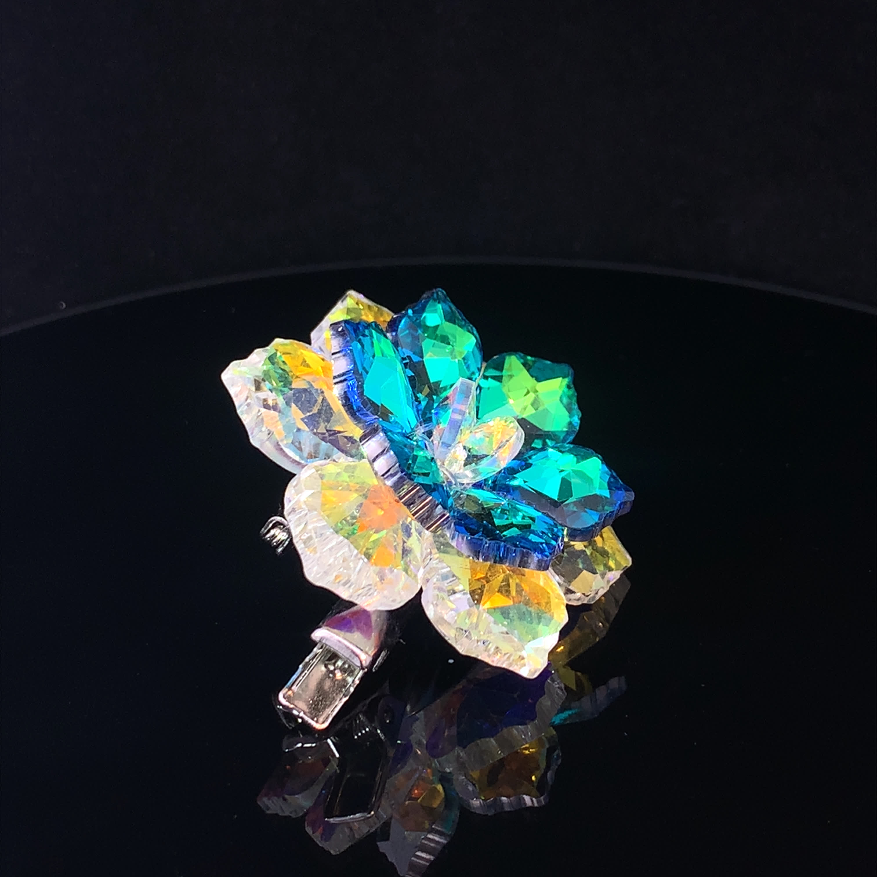 Broszka z kryształkami w kształcie kwiatów z zielono-niebieskimi okrągłymi koralikami kaboszonowymi