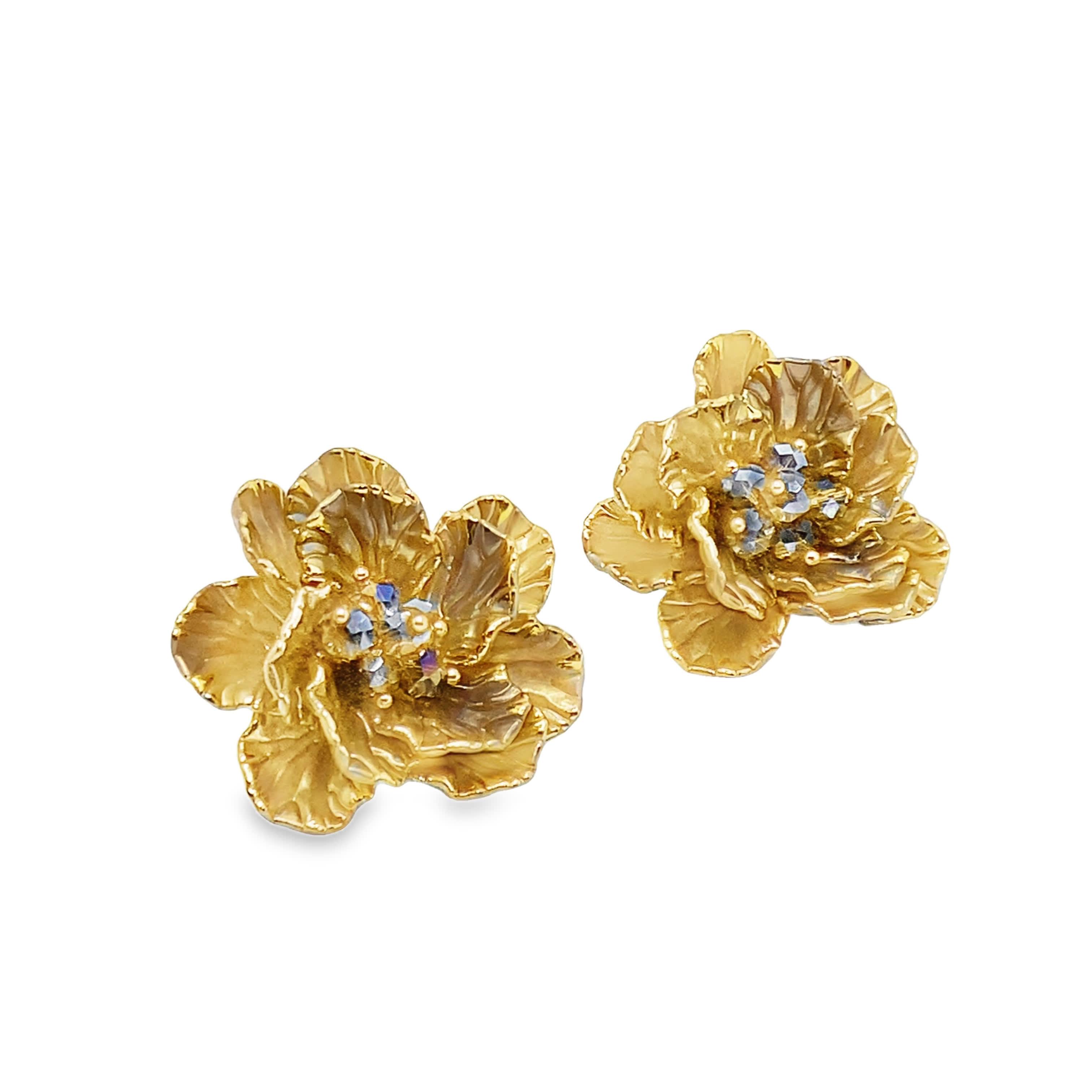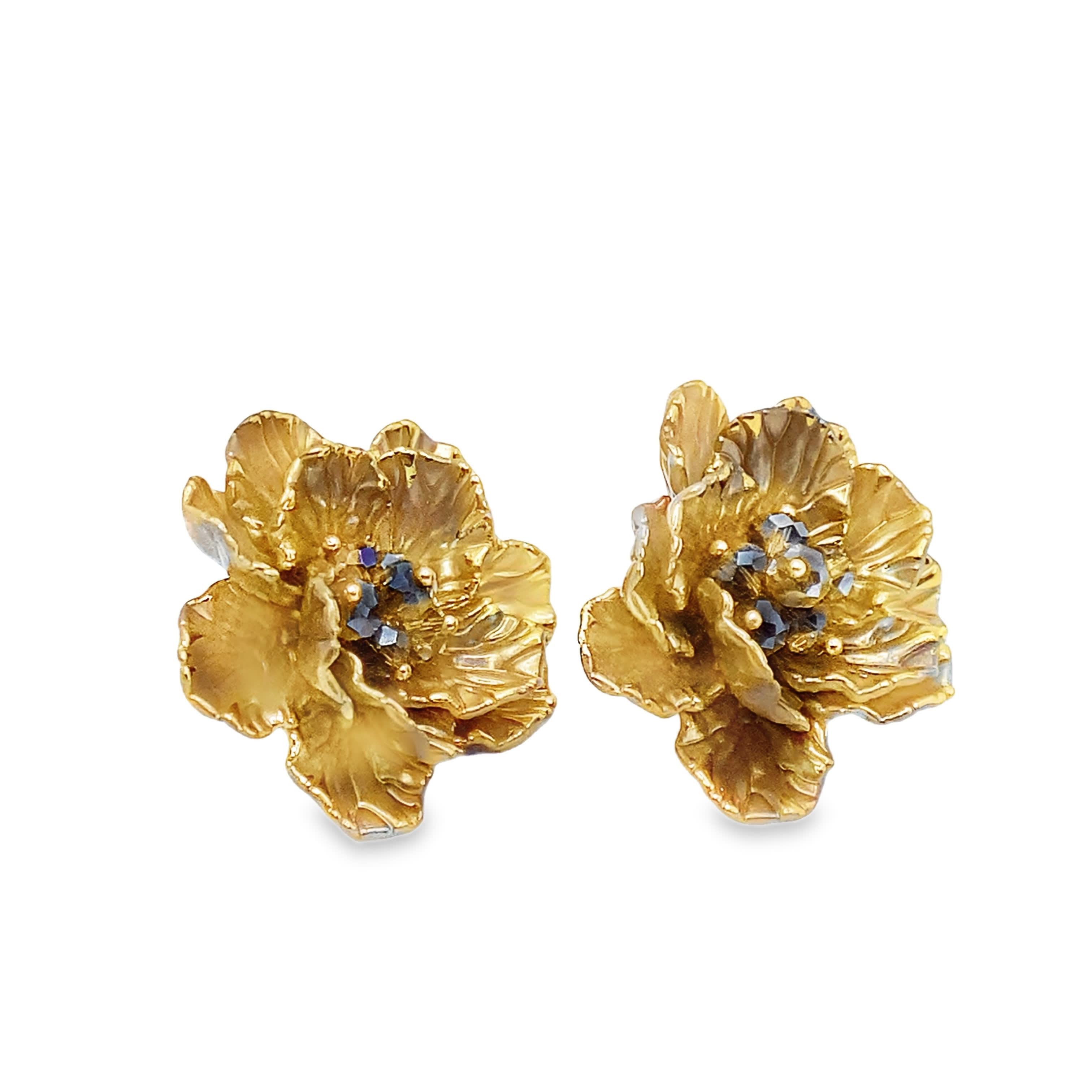 Wynieś swój styl na nowy poziom dzięki tym czarującym kolczykom-sztyftom. Kwiatowy wzór, starannie wykonany na bazie z niemetalu w głębokim żółtym złocie, uzupełniają błyszczące, okrągłe kryształki osadzone w formie kaboszonu. Kolczyki te oferują idealne połączenie elegancji i nowoczesnego stylu.