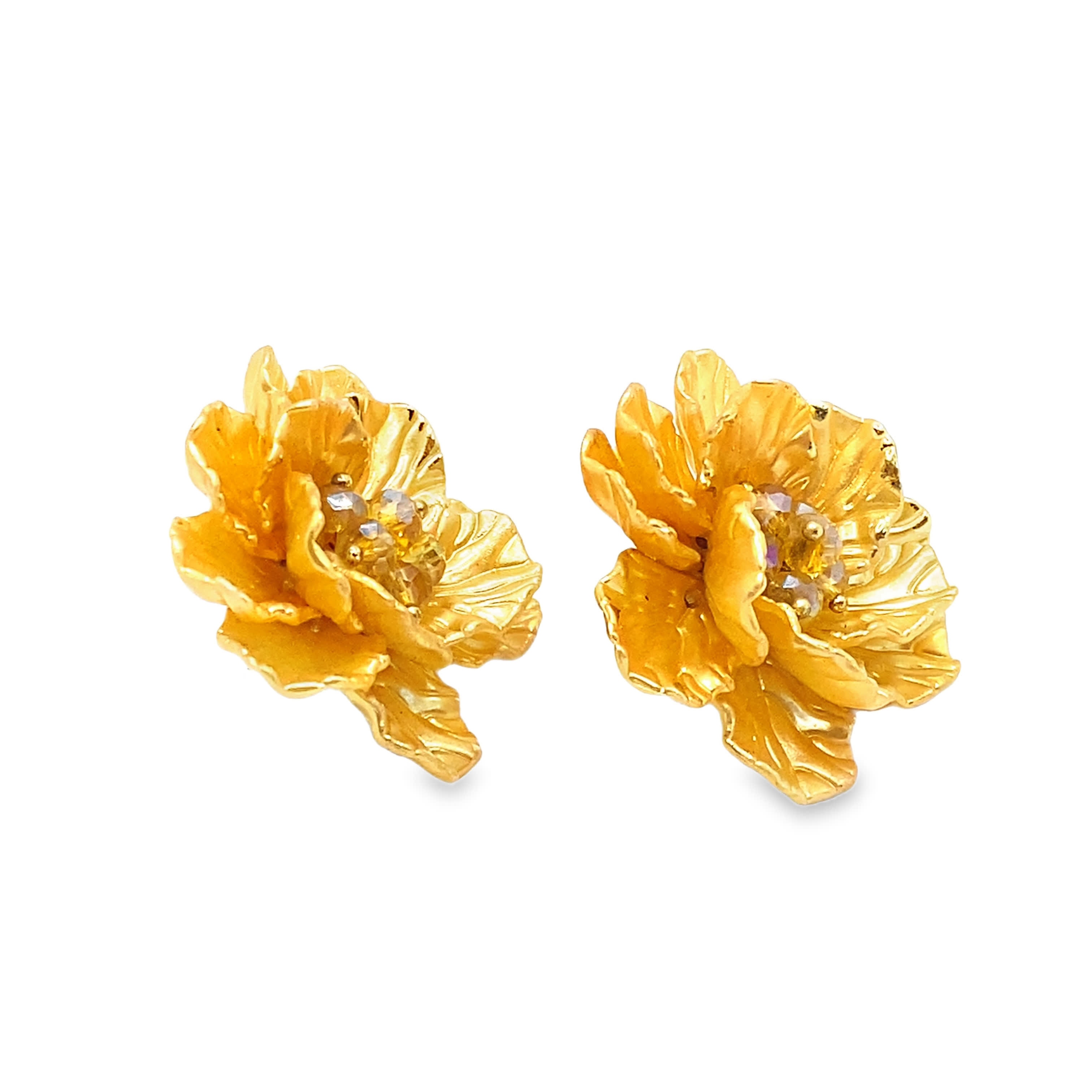 Podkreśl swój strój tymi wykwintnymi kolczykami ze złoconej stali. Wzór zdobią delikatne motywy kwiatowe, każdy ozdobiony misternie ułożonymi, okrągłymi kryształkami o szlifie kaboszonowym, które dodają im zachwycającego blasku. Te kolczyki to idealne połączenie ponadczasowego wzornictwa i wyrafinowania.