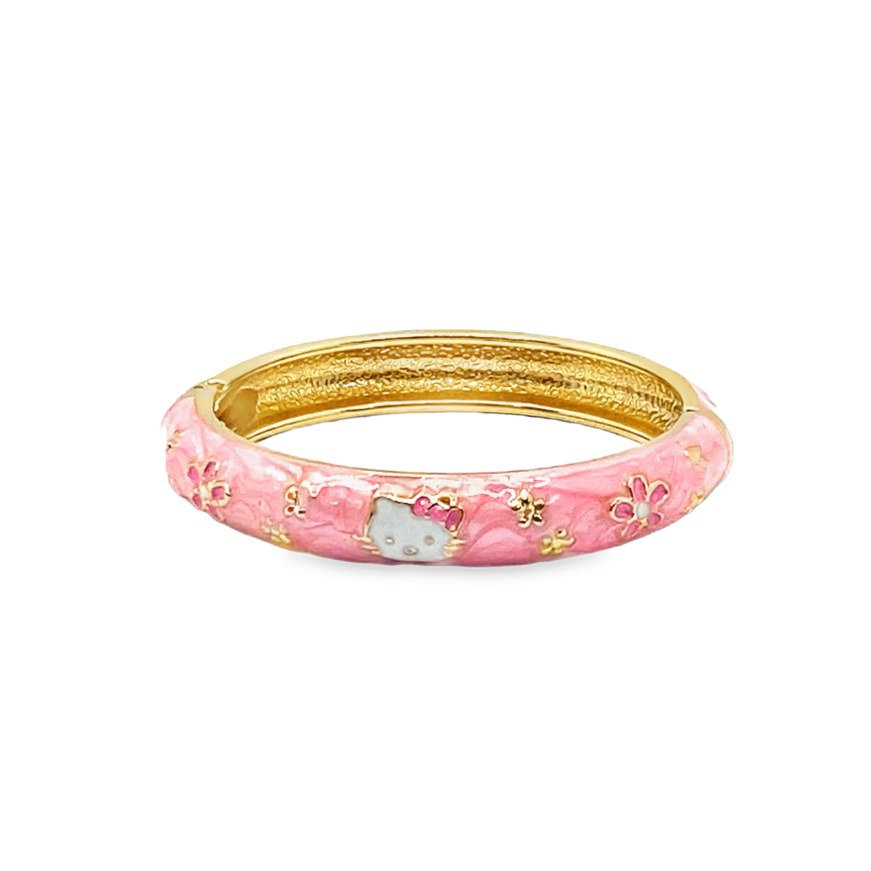 Podkreśl swój styl tą uroczą bransoletką. Żółta, złocona podstawa stanowi promienne tło dla delikatnej, różowej emalii, ozdobionej fantazyjnymi postaciami Hello Kitty i kwiatowymi rysunkami. Ten zachwycający dodatek doda każdej stylizacji odrobinę figlarnej elegancji.
