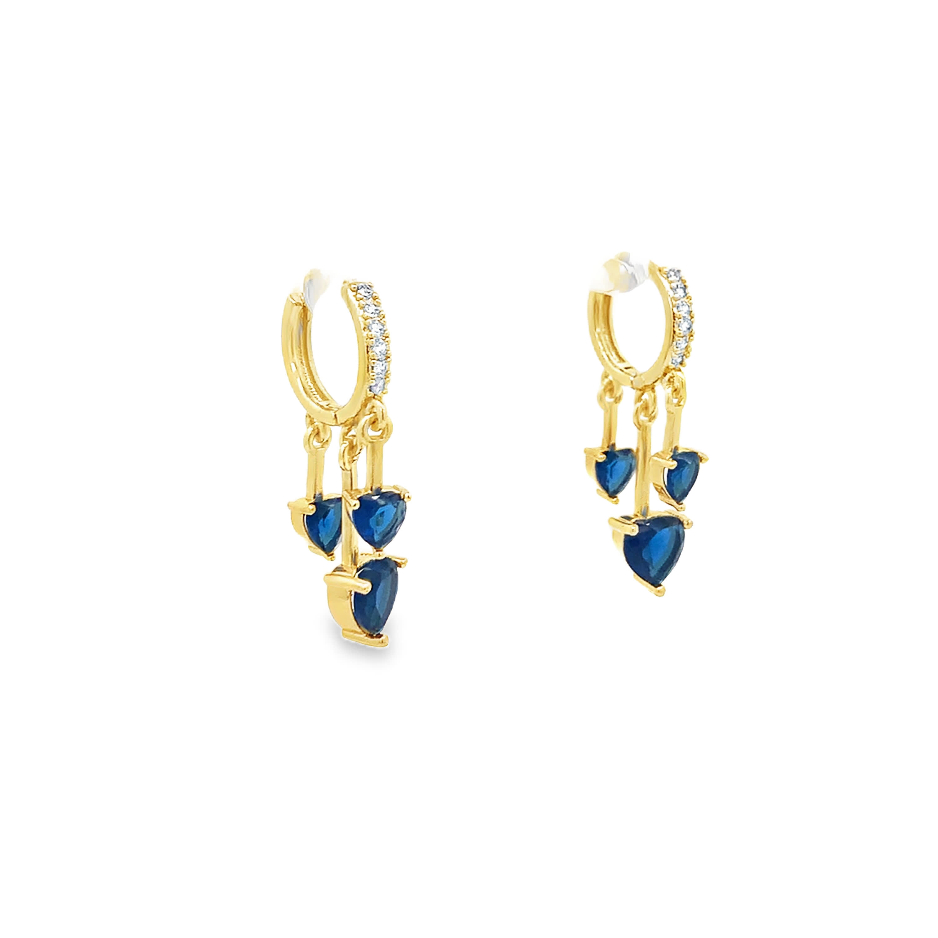 Kolczyki wiszące w kolorze żółtego złota z głębokimi niebieskimi szafirowymi sercami