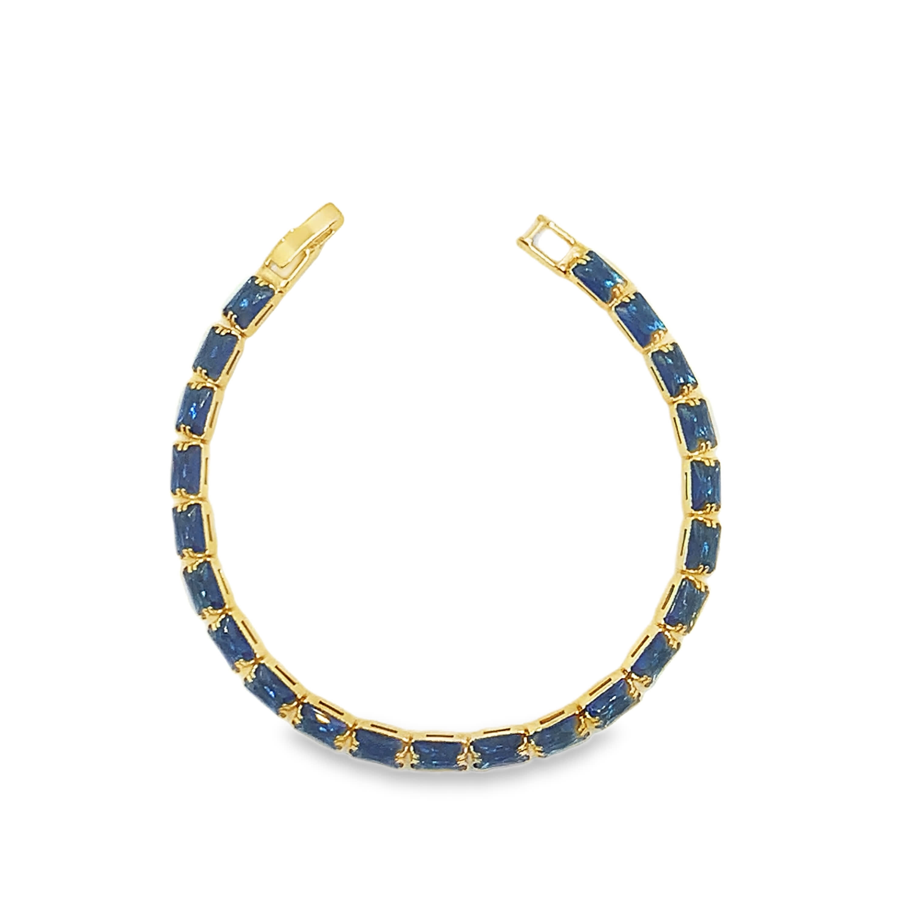 Bransoletka tenisowa w kolorze żółtego złota z szafirami o głębokim niebieskim szlifie szmaragdowym