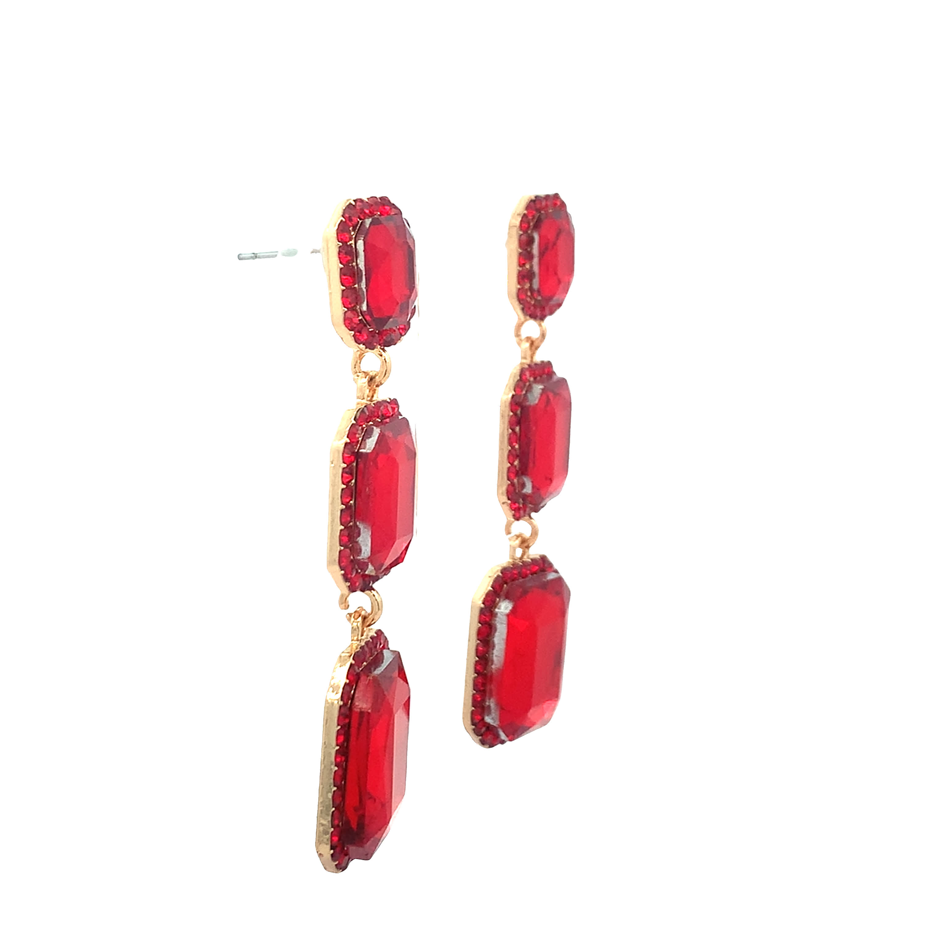 Kolczyki wiszące w kolorze żółtego złota z rubinami o szlifie szmaragdowym