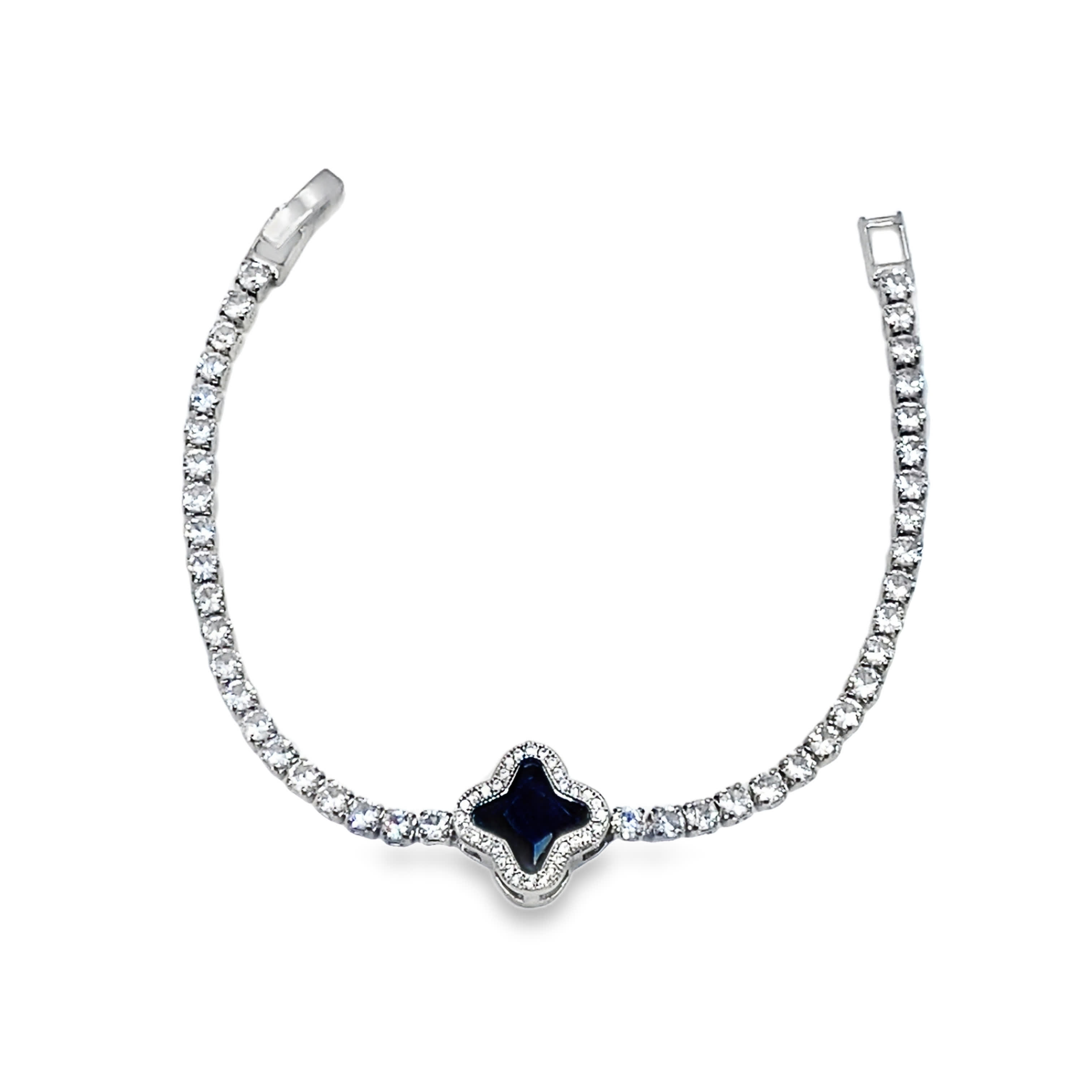 Wykwintna bransoletka tenisowa, wykonana z lśniącego srebra i platerowana białym złotem, emanuje ponadczasową elegancją. Każdy okrągły diament jest pieczołowicie osadzony, aby zapewnić mu maksymalny blask. Akcent w kształcie koniczyny podkreśla unikalny design bransoletki, czyniąc ją wyrafinowanym dodatkiem, który płynnie łączy klasyczny urok z nowoczesnym wdziękiem.