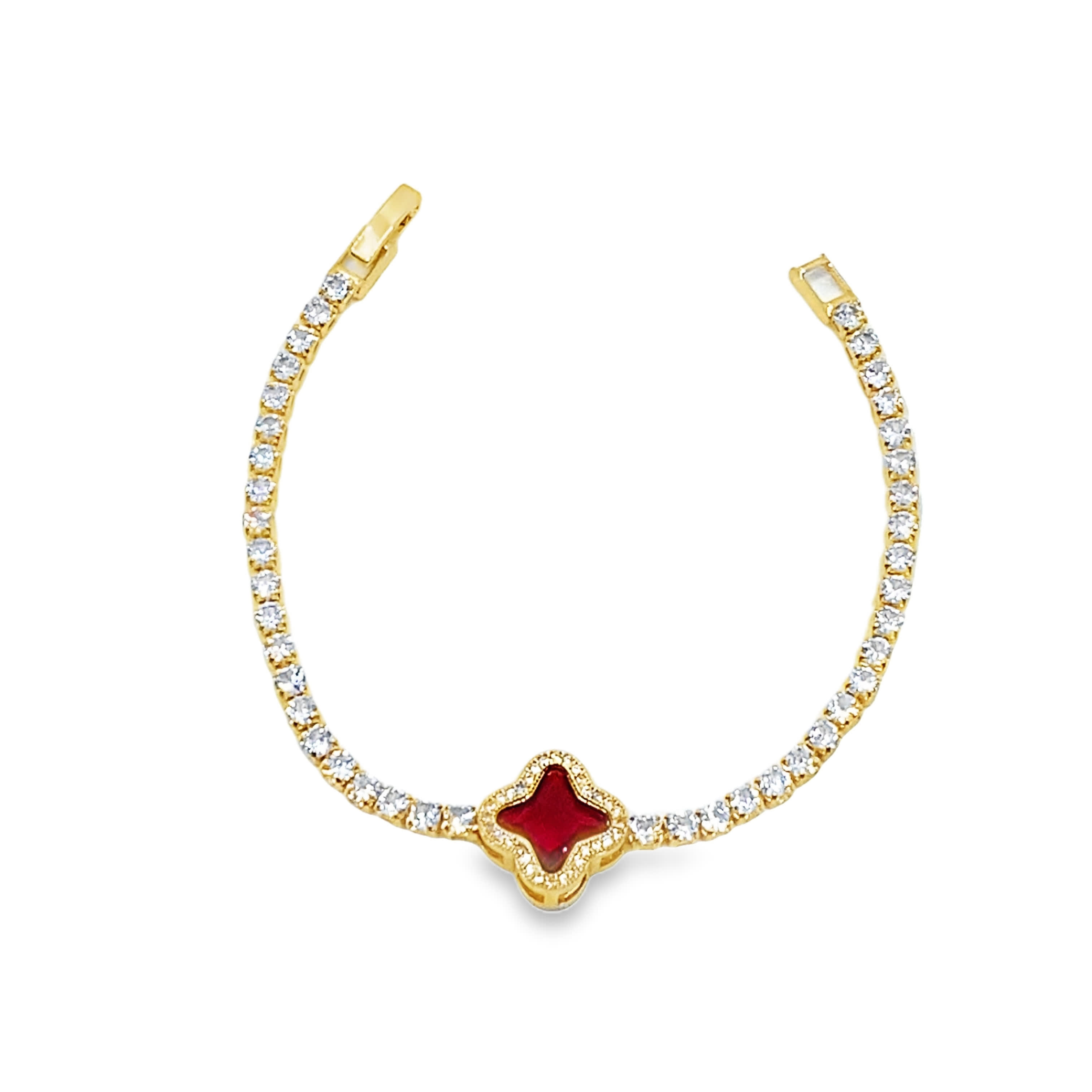 Wykwintna, 14-karatowa, żółta bransoletka tenisowa z hipnotyzującym połączeniem diamentów, osadzonych w klasycznej, czterozębowej oprawie. Centralnym elementem jest okrągły, czerwony rubin o szlifie kaboszonowym. Starannie wykonana, z doskonałym połyskiem i symetrią, bransoletka emanuje wyrafinowaniem i blaskiem.