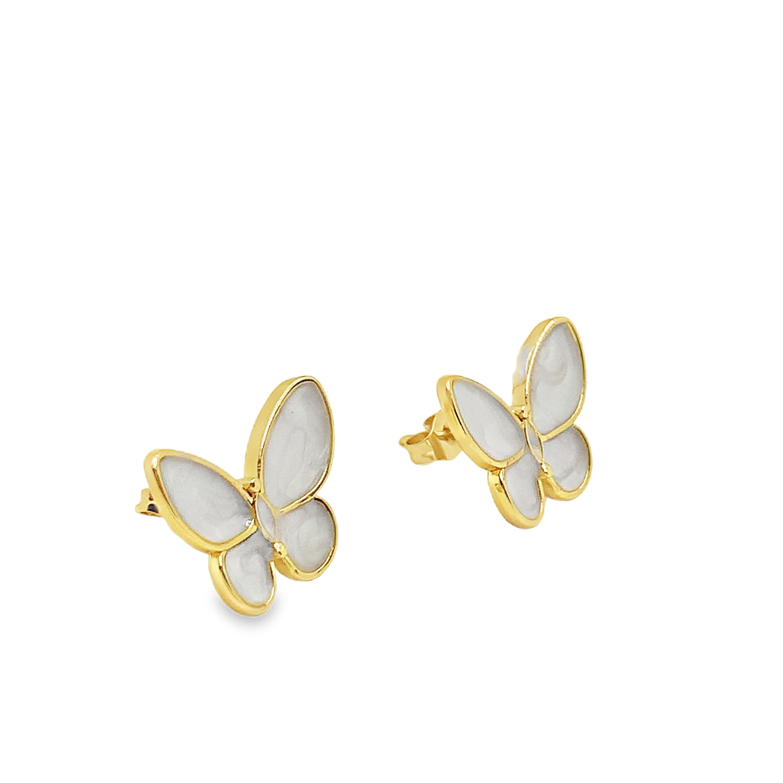 Kolczyki-wkrętki z żółtego złota w kształcie motyla z perłowymi kaboszonami