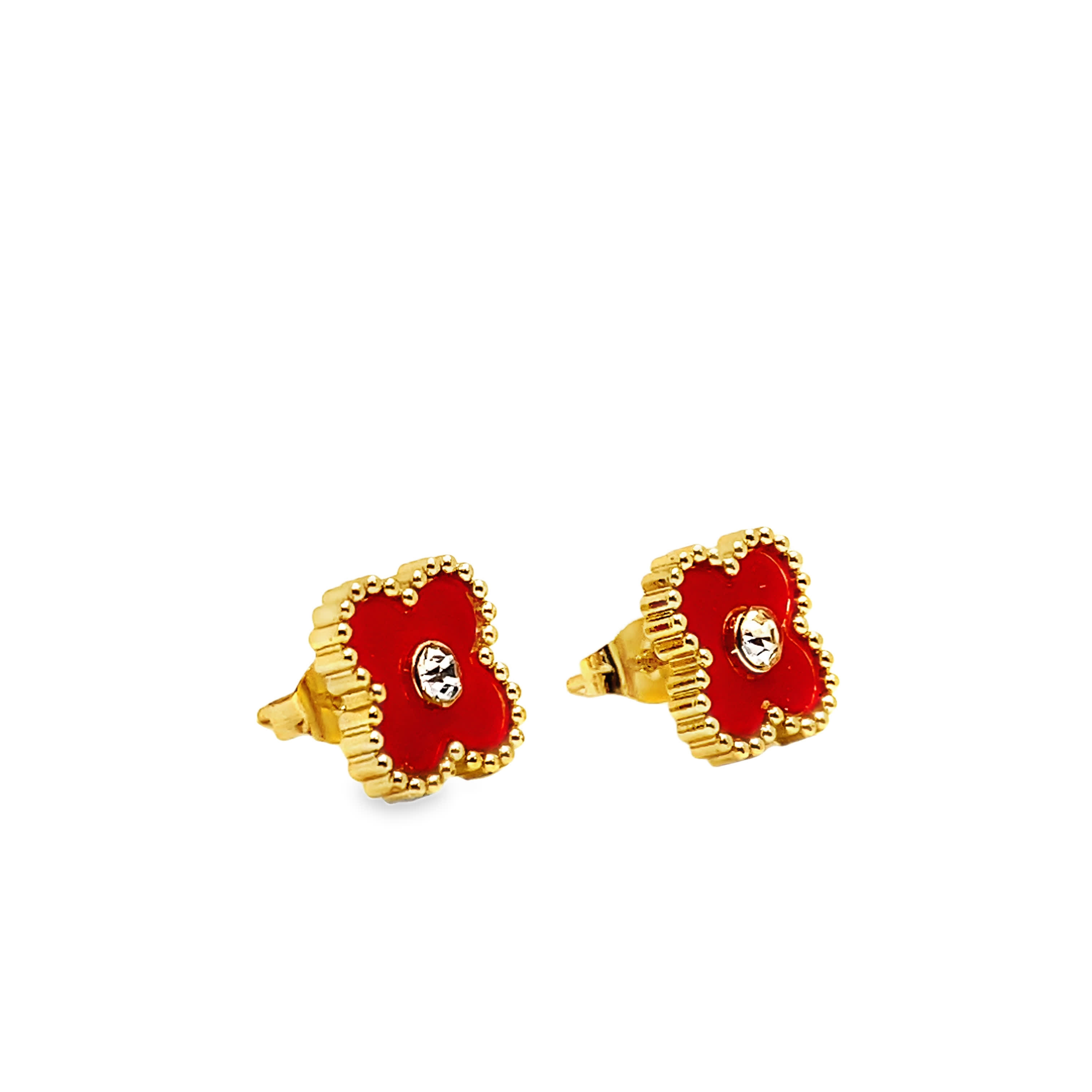 Kolczyki sztyfty z żółtego złota z okrągłymi diamentami o szlifie brylantowym i motywem czerwonej koniczyny