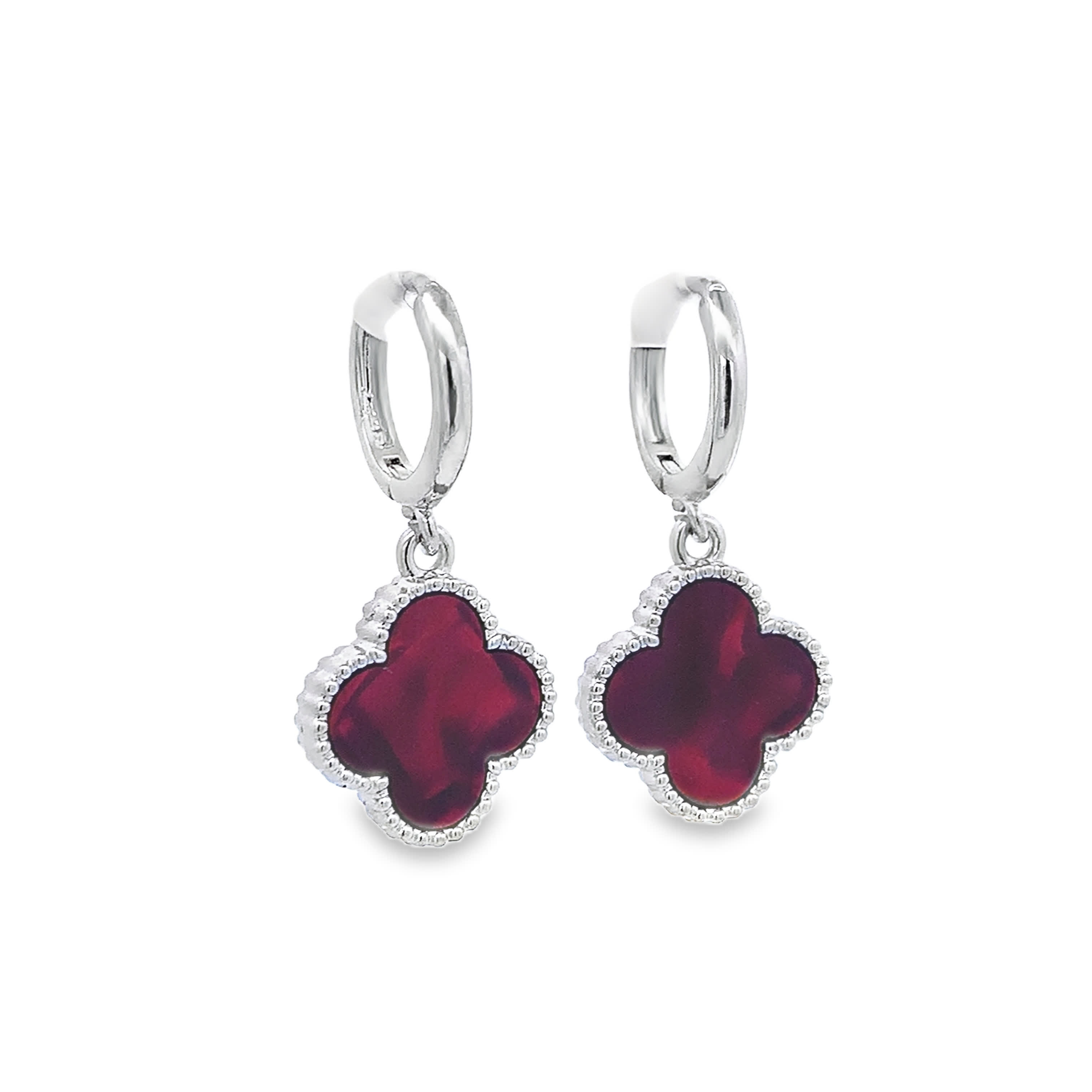 Sterling Silver Dangle Earrings with Round Cabochon Red Ruby Clovers