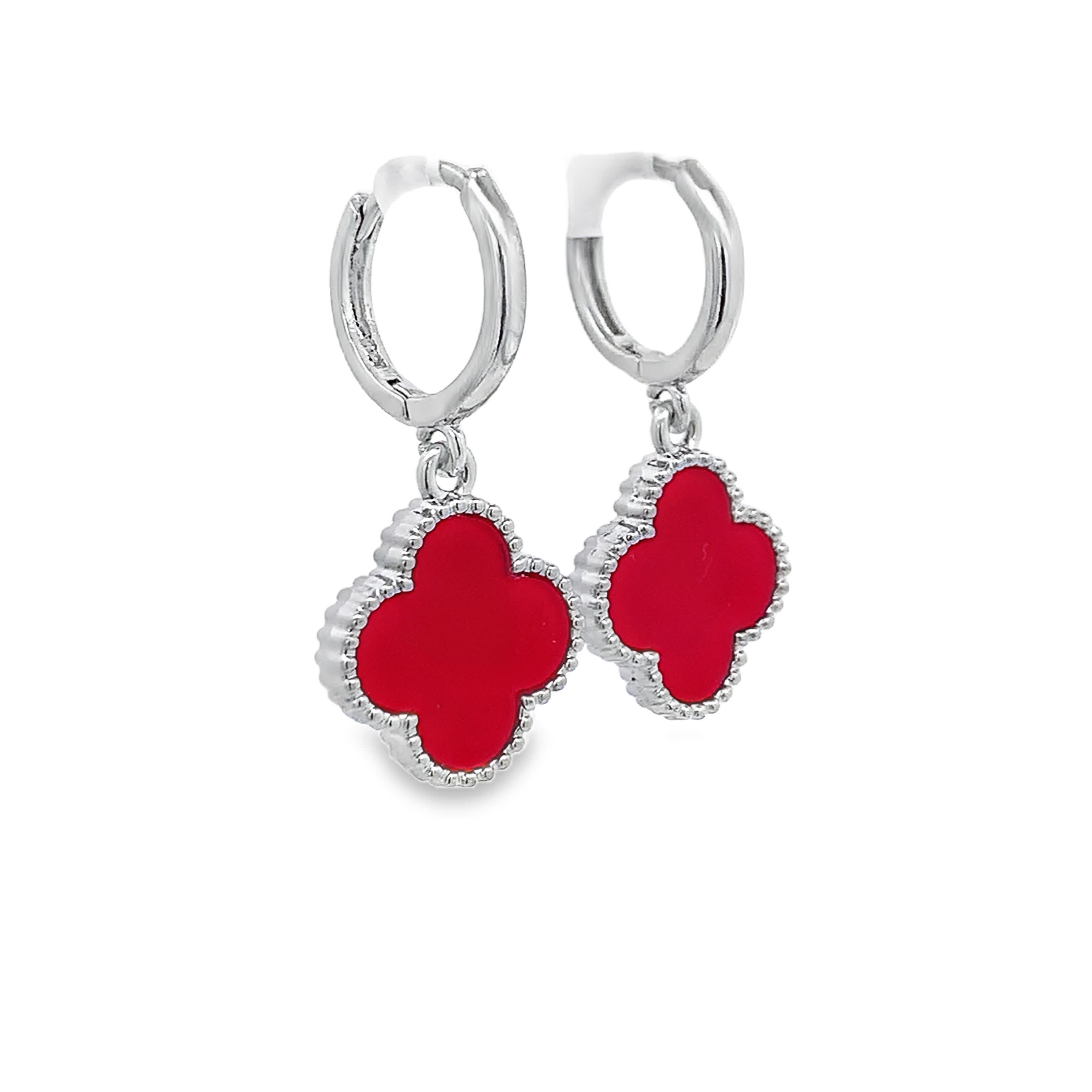 White Gold Plated Silver Dangle Earrings with Clover Shape Coral Gemstones