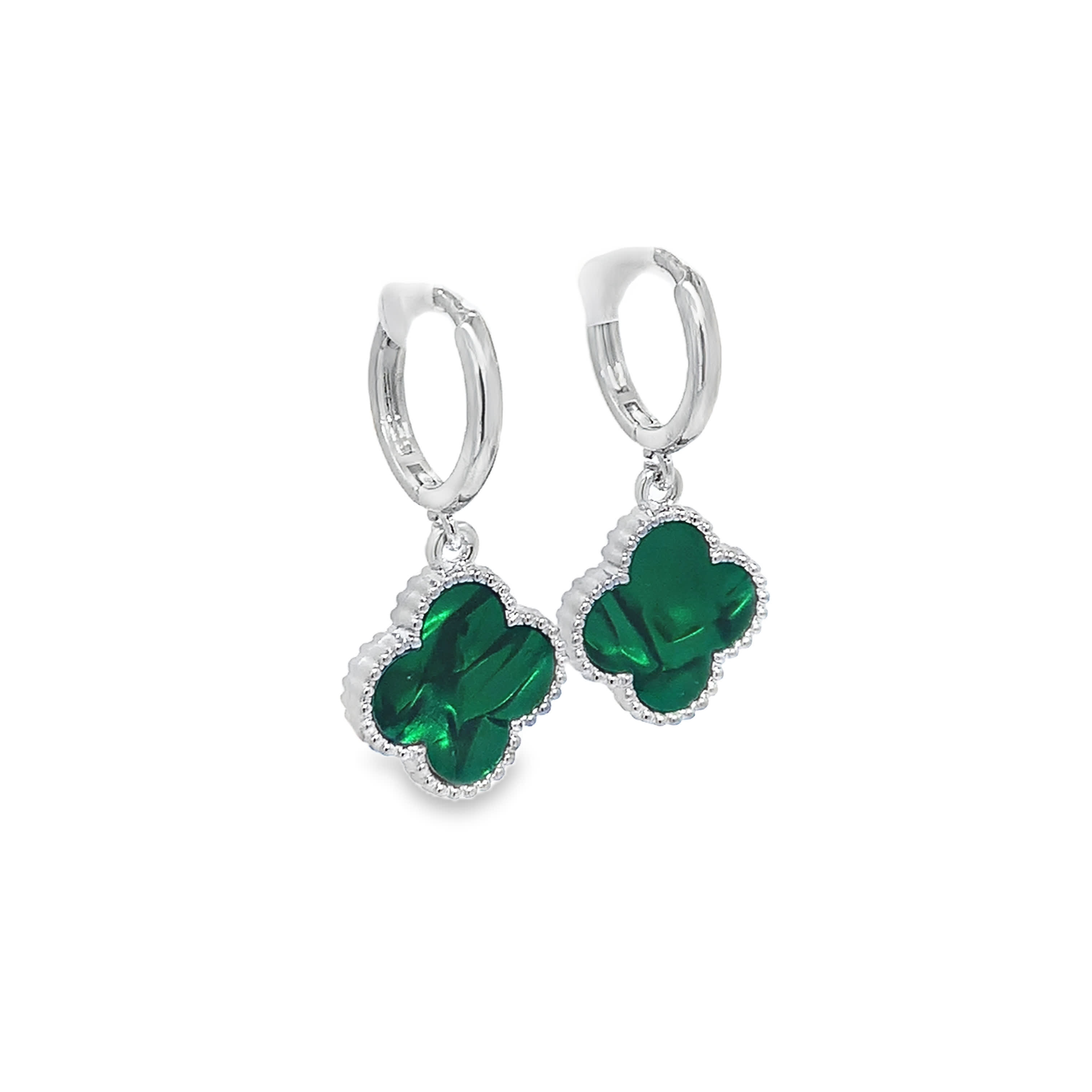 Clover Malachite Dangle Earrings in White Gold over Silver