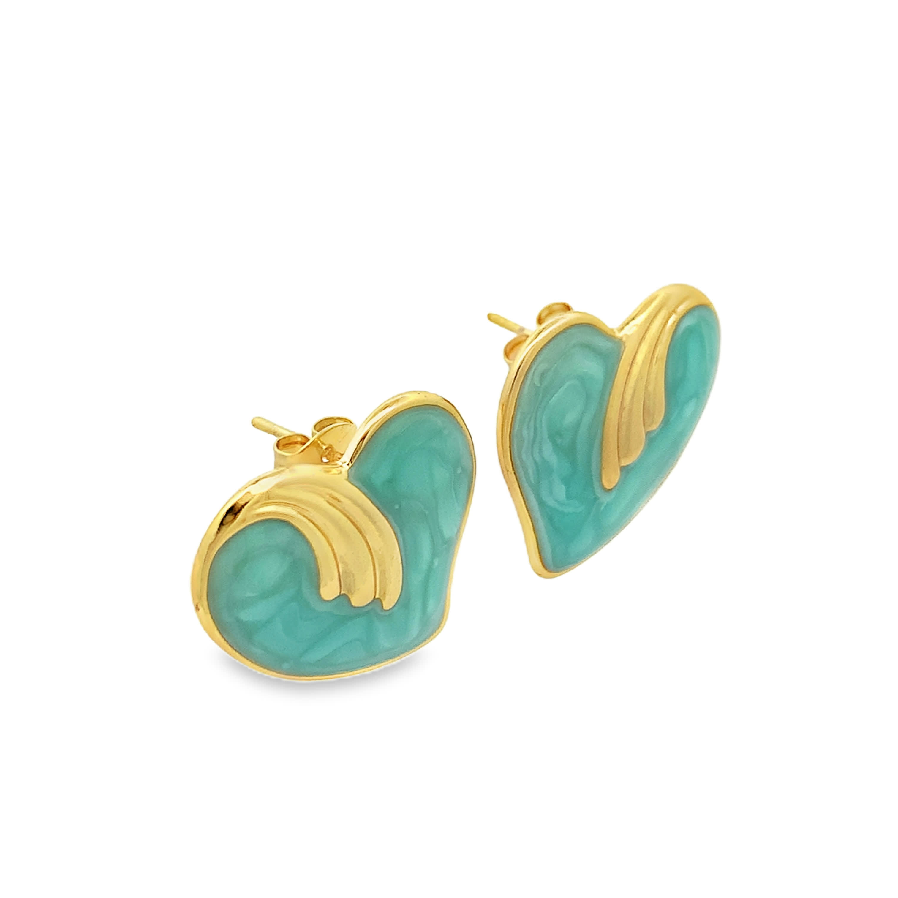 Pozłacane kolczyki sztyfty z zielono-niebieskim sercem z kamienia kaboszon