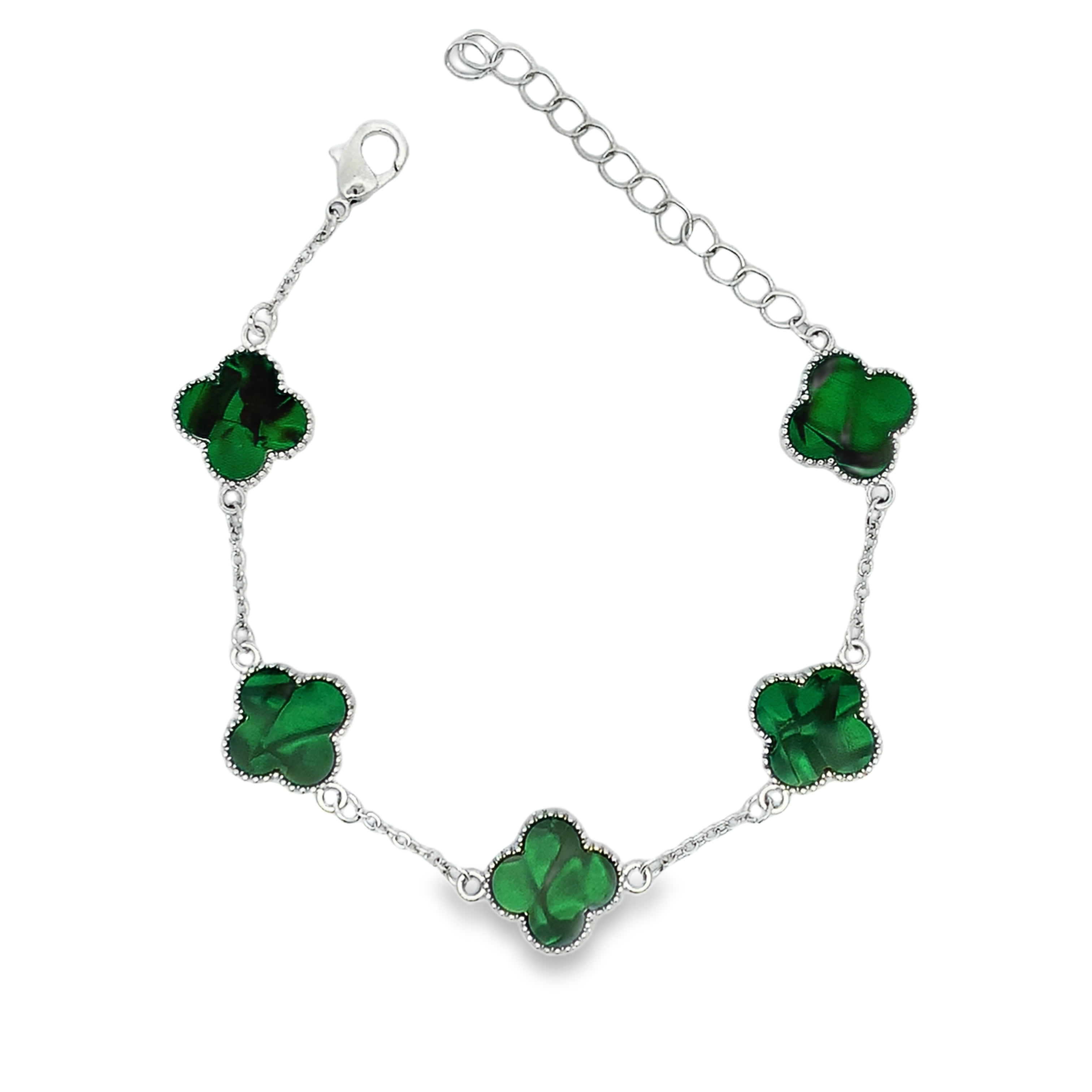Posrebrzana bransoletka z motywem czterolistnej koniczyny i zielonym kamieniem