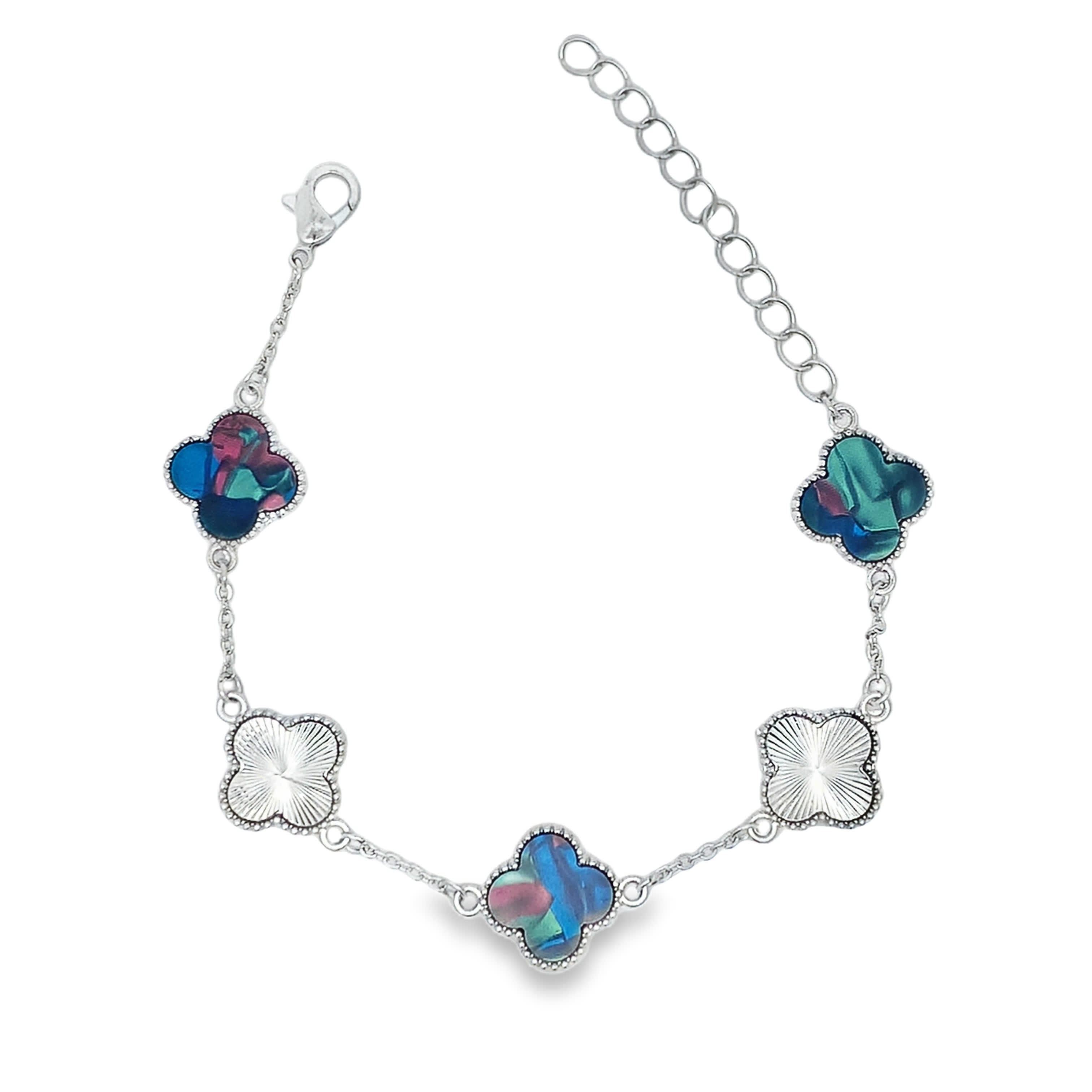 Posrebrzana bransoletka charms koniczyna z wielokolorowym wykończeniem, kamieniem zielonego agatu i giloszem