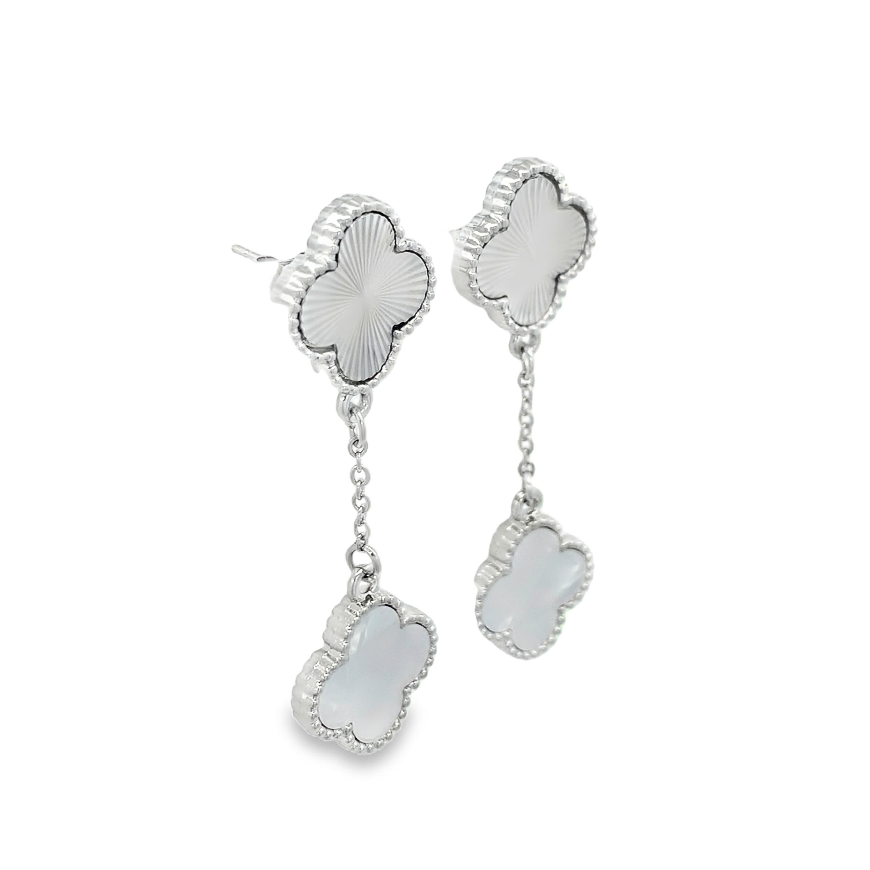 Posrebrzane wiszące kolczyki koniczyna z giloszem i akcentem perłowym