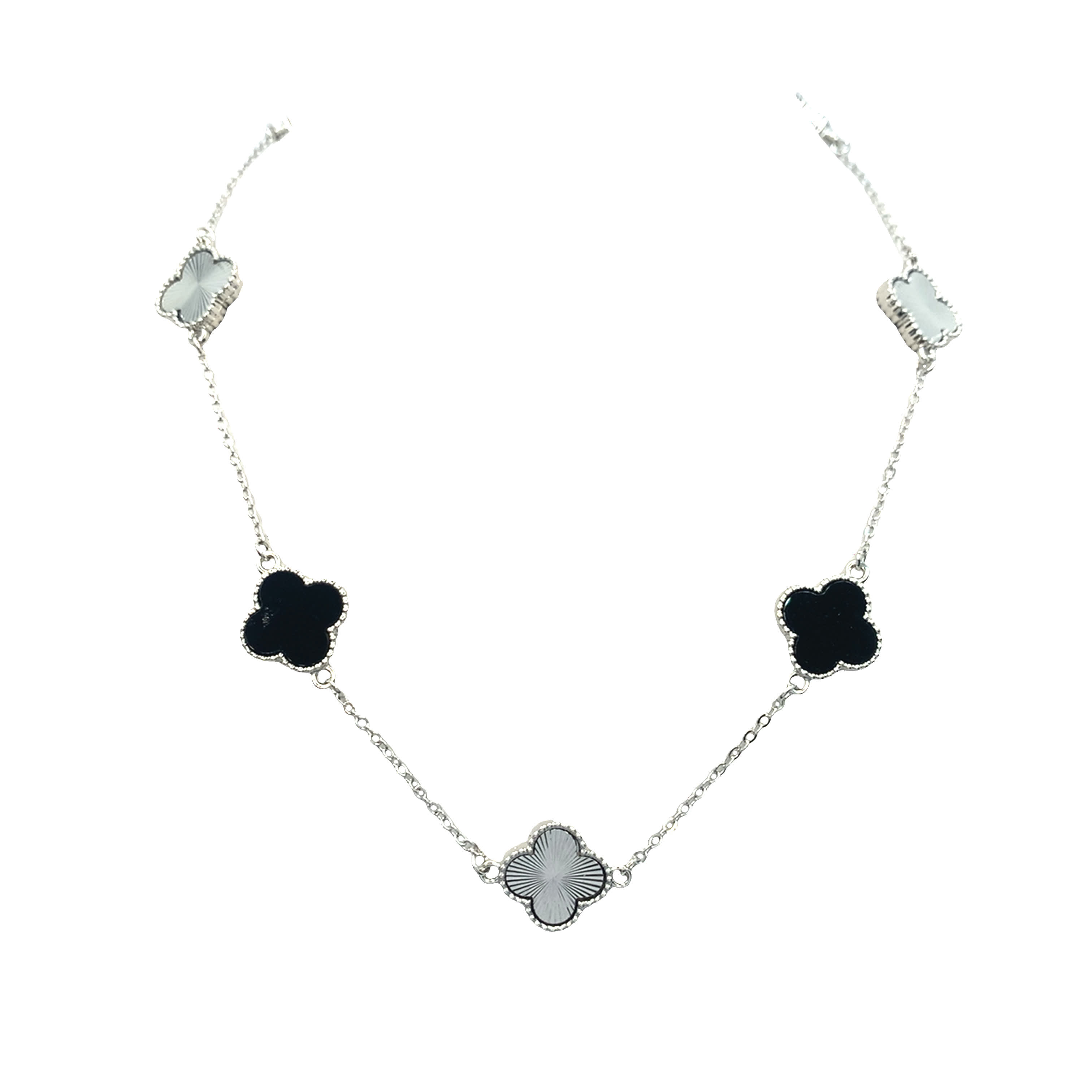 White Gold Clover Necklace with Agate and Mother of Pearl Stations